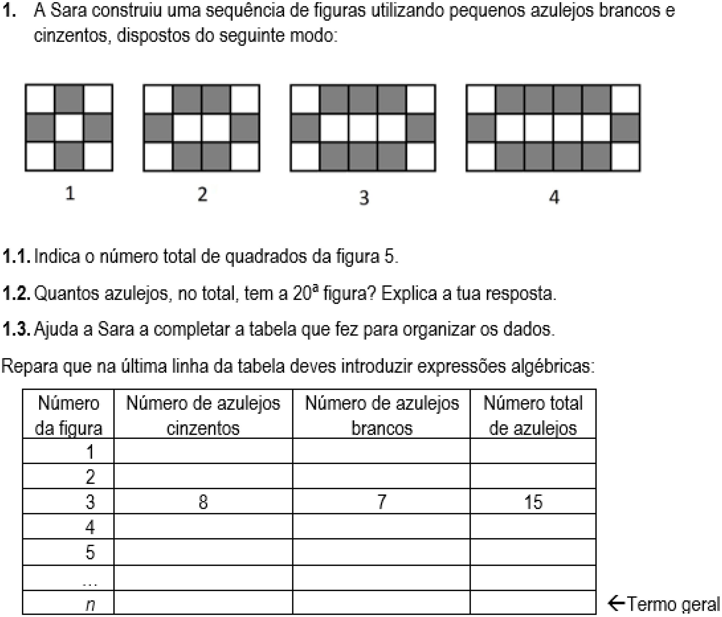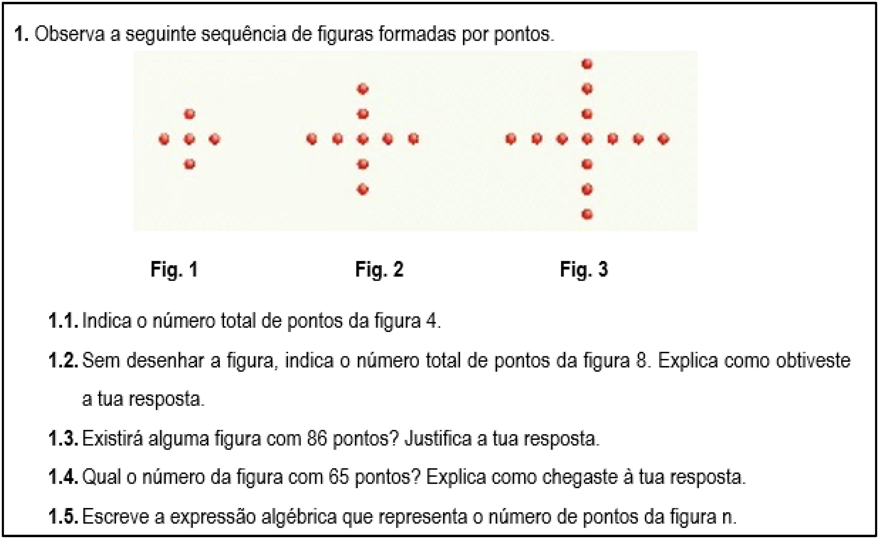 A tarefa proposta para a introdução da unidade de ensino sobre sequências é a apresentada na Figura 2. Esta tarefa, de natureza exploratória (princípio a), inclui questões de nível de desafio reduzido, como a questão 1.1, e questões de nível de desafio mais elevado, como a questão 1.5 (princípio d). Esta última questão, ao solicitar o termo geral da sequência, incita a formulação de uma generalização (princípio b). Uma parte das questões solicita ainda explicações ou justificações (princípio c).