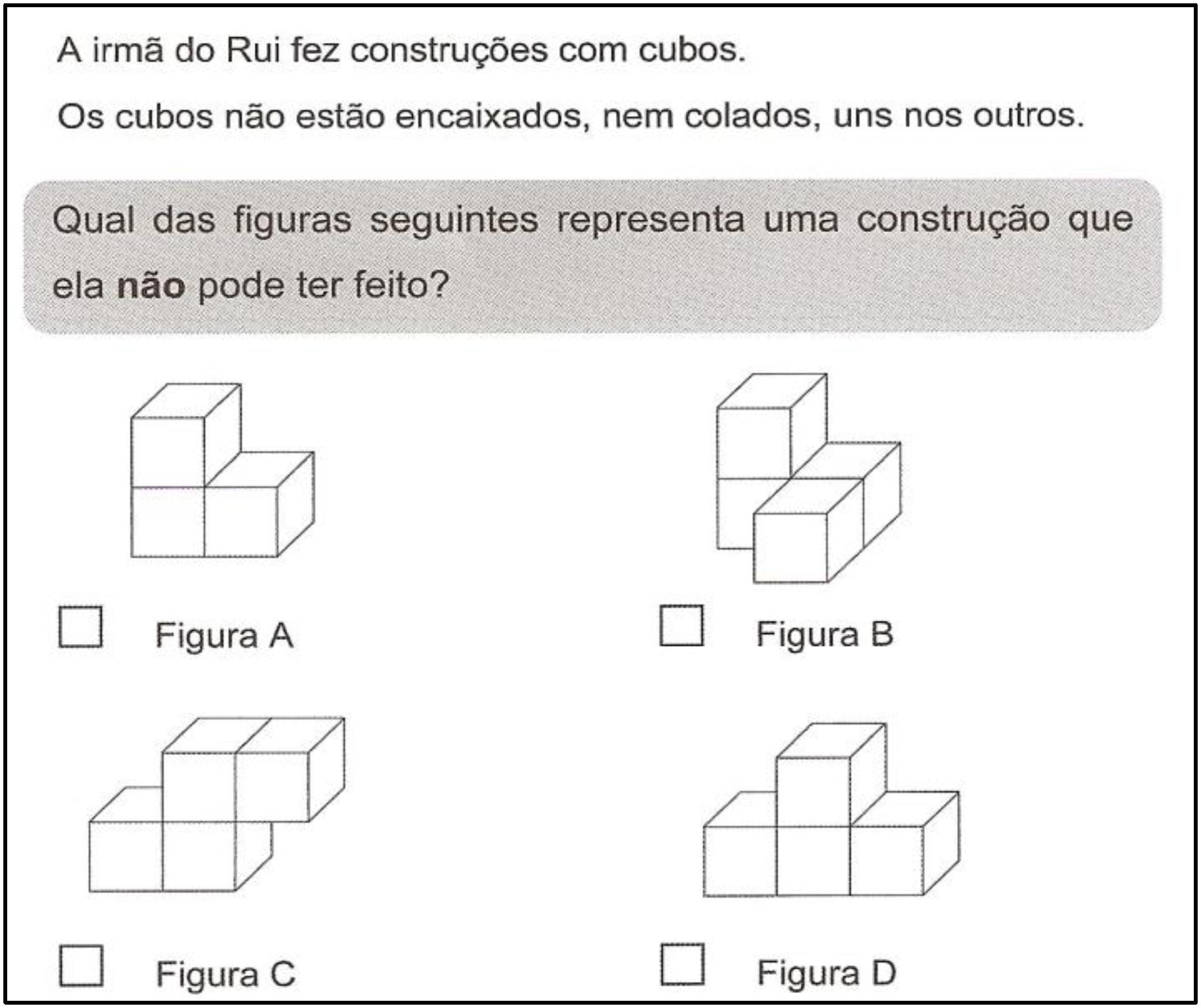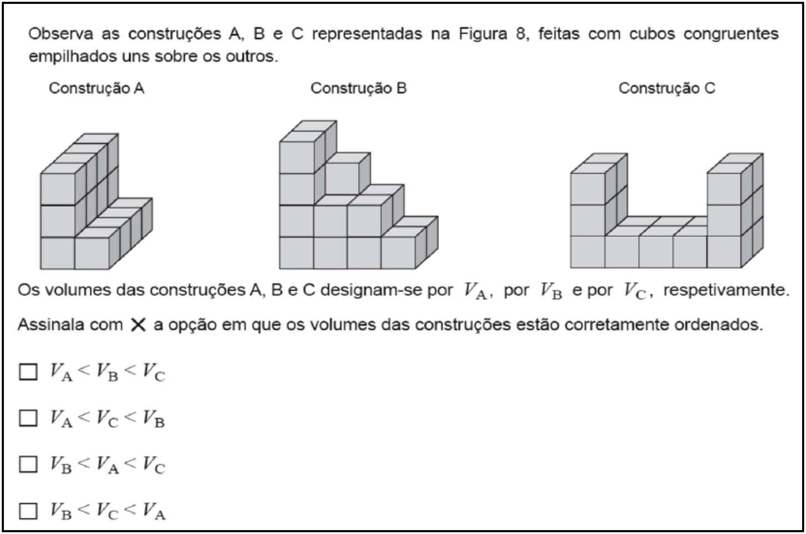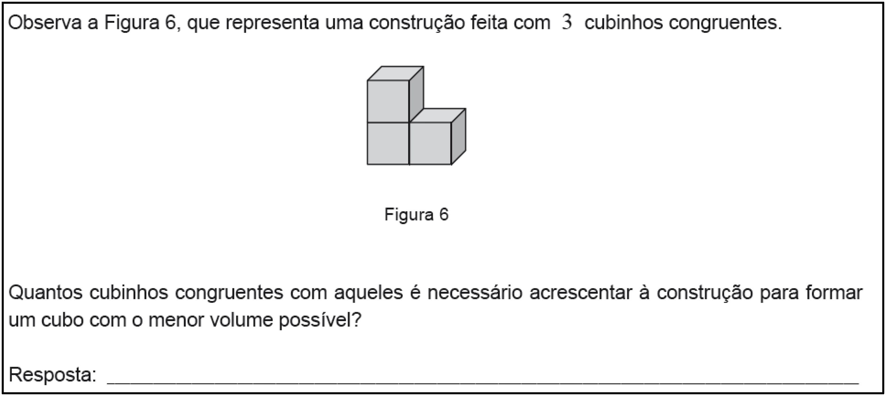 Para responder corretamente a esta tarefa é necessário interpretar as representações bidimensionais de construções tridimensionais apresentadas, evocar capacidades de visualização espacial, utilizar com eficácia o processamento visual e, sobretudo, saber interpretar a informação figurativa.