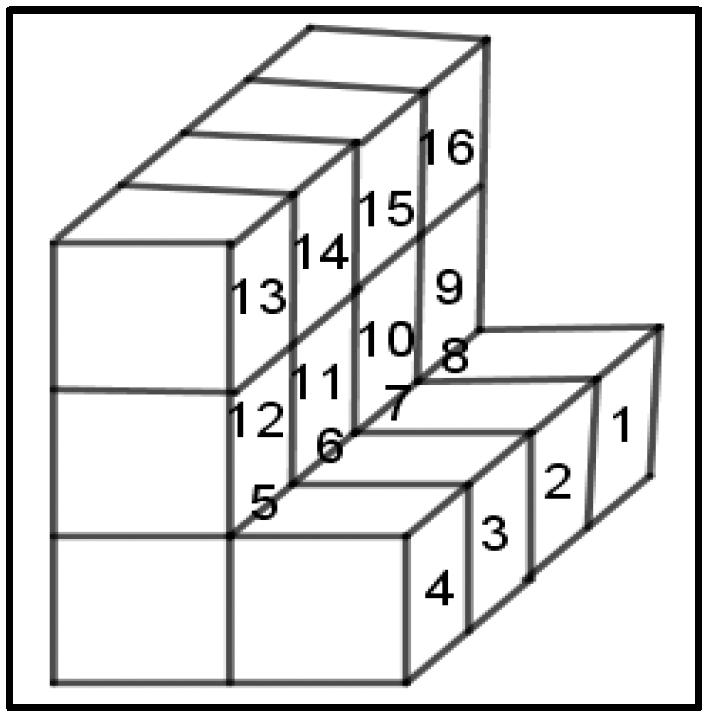 Battista e Clements (1996) observaram uma sequência de “etapas cognitivas” dos alunos, à medida que eles trabalharam a “estruturação espacial” com construções tridimensionais. Os autores definem “estruturação espacial” como o ato mental de construir uma organização ou forma para um objeto ou conjunto de objetos. O processo mental inclui o estabelecimento de unidades, estabelecendo relações entre as mesmas e reconhecendo que um subconjunto dos objetos, se repetido corretamente, pode gerar todo o conjunto. Os resultados do estudo sugeriram uma sequência hipotética de concepções ou etapas cognitivas. Nesta sequência, a concepção inicial dos alunos de uma construção tridimensional de policubos é como um conjunto de “faces não coordenadas”. Como não conseguem conciliar as diferentes vistas (não conseguem reorganizar a forma como as vistas do prisma se encaixam, ou seja, como devem ser colocadas em posições apropriadas uma em relação à outra), eles cometem muitos erros de contagem, contando, por exemplo, duplamente os cubos que apareceram em uma aresta comum de faces adjacentes de um prisma. À medida que os alunos se tornam capazes de coordenar as vistas e, ao refletir sobre experiências com contagem ou construção de configurações de cubos, eles podem passar a ver a construção como o preenchimento do espaço, esforçando-se para reestruturá-lo como tal. Aqueles que completam uma reestruturação global da construção - concepção integrada que necessita do reconhecimento de como as vistas estão inter-relacionadas espacialmente, formando uma imagem mental integrada e coerente do todo - concebem unidades compostas, ou seja, eles veem a construção como sendo composta de múltiplas camadas em vez de apenas uma coleção de cubos unitários. Os autores referem que apenas os alunos que estão nesta categoria parecem “prontos” para começar a formular o próprio procedimento de contagem de forma mais abstrata em termos de uma fórmula.