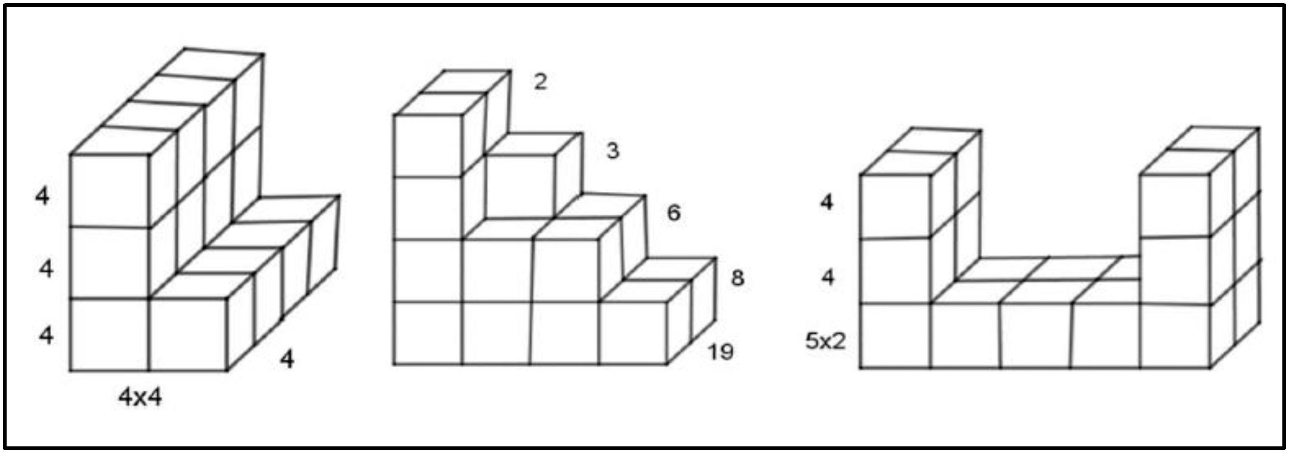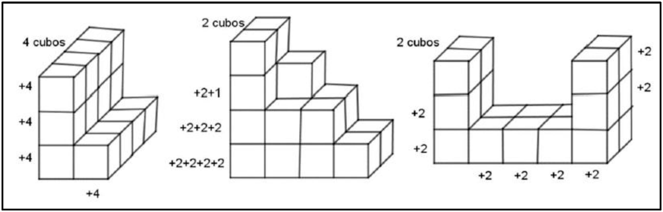 As figuras encontram-se representadas em perspectiva, a qual permite ter uma visão frontal, uma visão lateral e uma visão superior do objeto real. Esta forma de representação de objetos tridimensionais no plano torna visível, pelo menos, uma das faces de um grande número de cubos e, por isso, facilita a sua contagem. A estratégia inicial usada pelos alunos foi a contagem dos cubos de cada figura e, para isso, eles tiveram que identificar os cubos visíveis e os invisíveis, entender a diferença entre a área da superfície lateral de um cubo e o seu volume. A tabela seguinte ilustra algumas das possibilidades de contagem segundo a possível estruturação espacial dos alunos.