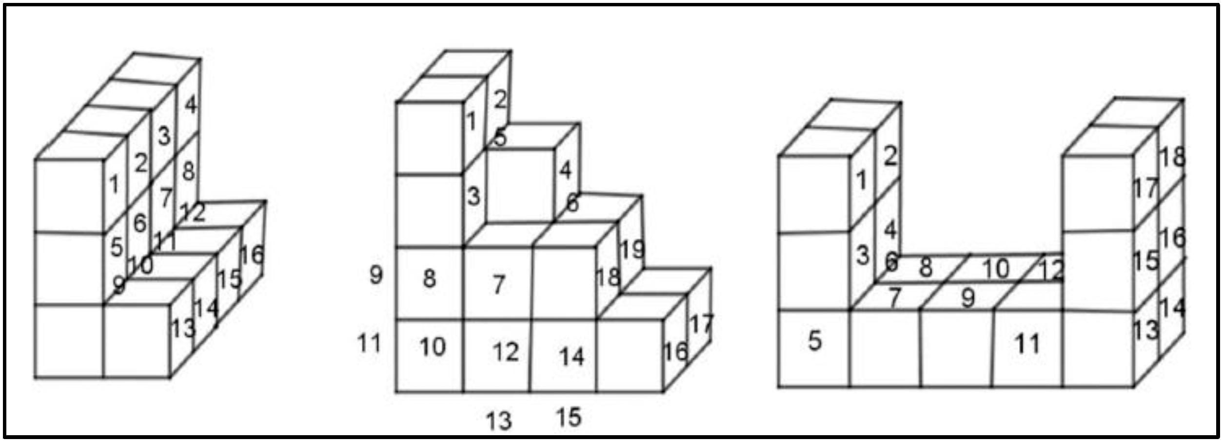Embora a estrutura espacial das construções tenha parecido óbvia para a maioria dos alunos, outros tiveram dificuldades significativas para conceituar a construção como uma estrutura coordenada global e de preenchimento de espaço, e contaram as faces dos cubos, contando duplamente os cubos das arestas e triplamente os cubos dos vértices, sem contar os cubos que não são visíveis. Por exemplo, o aluno A20 escreveu vinte e quatro ao lado da figura A, que é exatamente o número total de faces visíveis dessa construção.