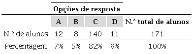 Os resultados obtidos pelos 171 alunos que resolveram a tarefa encontram-se representados na tabela seguinte. Da leitura da tabela 2, podemos verificar que uma grande percentagem de alunos conseguiu utilizar com eficácia o processamento visual e, sobretudo, o processo de interpretação da informação figurativa (82% escolheu a opção que corresponde à questão colocada).