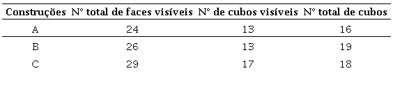 Entre outras possibilidades, os alunos podem contar atendendo ao número total de faces visíveis, ao número de cubos visíveis ou ao número de cubos visíveis e invisíveis.