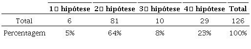 Na tabela 4, observa-se que 23% dos alunos escolheram a quarta hipótese. Verificamos nas entrevistas que este erro pode explicar-se porque, apesar de saberem identificar o número de cubos que tem cada construção, não identificaram o sinal “<” como “menor que” e, por isso, colocaram os volumes por ordem decrescente: