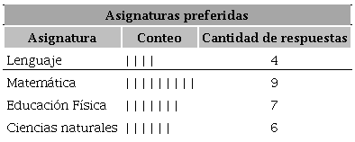 A un grupo de estudiantes de tercero básico se le aplicó una encuesta y las respuestas a una de las preguntas se organizaron en la siguiente tabla.