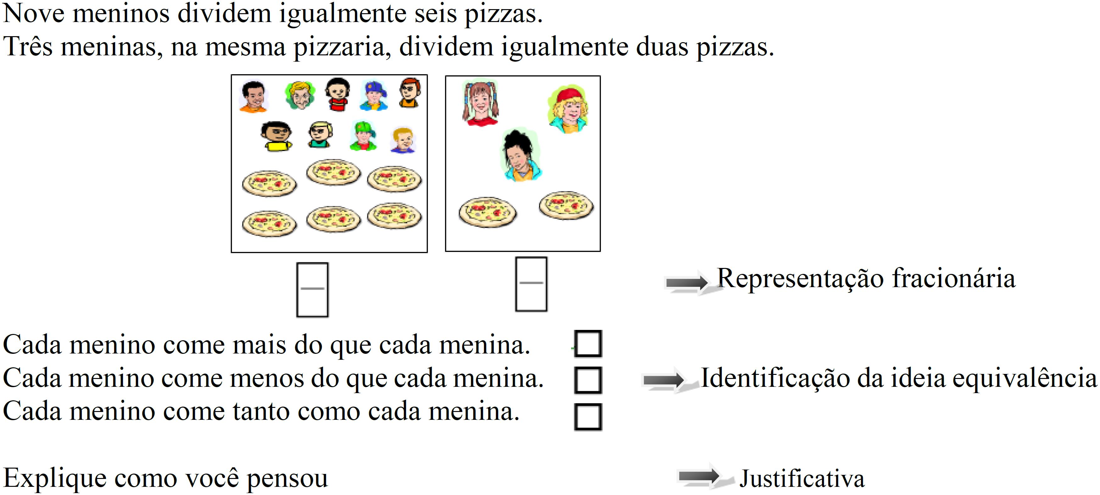 O teste foi aplicado por uma das pesquisadoras, que leu cada questão com as crianças, dando um tempo entre uma leitura e outra, para que elas pudessem refletir e respondê-las. Após a análise das respostas, percebemos que uma das questões teve um índice muito baixo de acerto e decidimos investigar um pouco mais sobre seu entendimento. Nesse mesmo ano foi desenvolvido, em meses posteriores, no período de 04 de setembro a 27 de novembro em um módulo do programa Observatório da Educação, um processo formativo com professores dos Anos Iniciais, com o tema Representação fracionária do número racional, no qual decidimos colocar para discussão essa questão. Tratava-se de uma atividade inspirada em Nunes et al. (2004) e classificada como quociente envolvendo a ideia de equivalência de frações. Ela é composta de duas situações e suas representações icônicas correspondentes com dois espaços destinados as respectivas representações fracionárias: