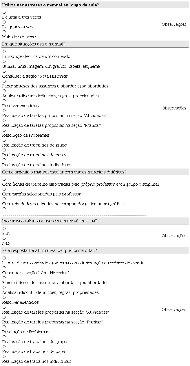 Como referimos na introdução, a principal finalidade deste estudo incide no modo como os manuais são utilizados pelo professor de Matemática e que efeitos daí resultam, quer em termos da aprendizagem dos alunos, quer ao nível do desenvolvimento profissional docente. Com o intuito de nortear o percurso investigativo referido, delinearam-se os seguintes objetivos específicos: (1) conhecer a frequência de utilização do manual escolar na sala de aula; (2) identificar modos de utilização do manual escolar dentro e fora da sala de aula; (3) compreender a relação entre o manual e o desenvolvimento profissional docente.