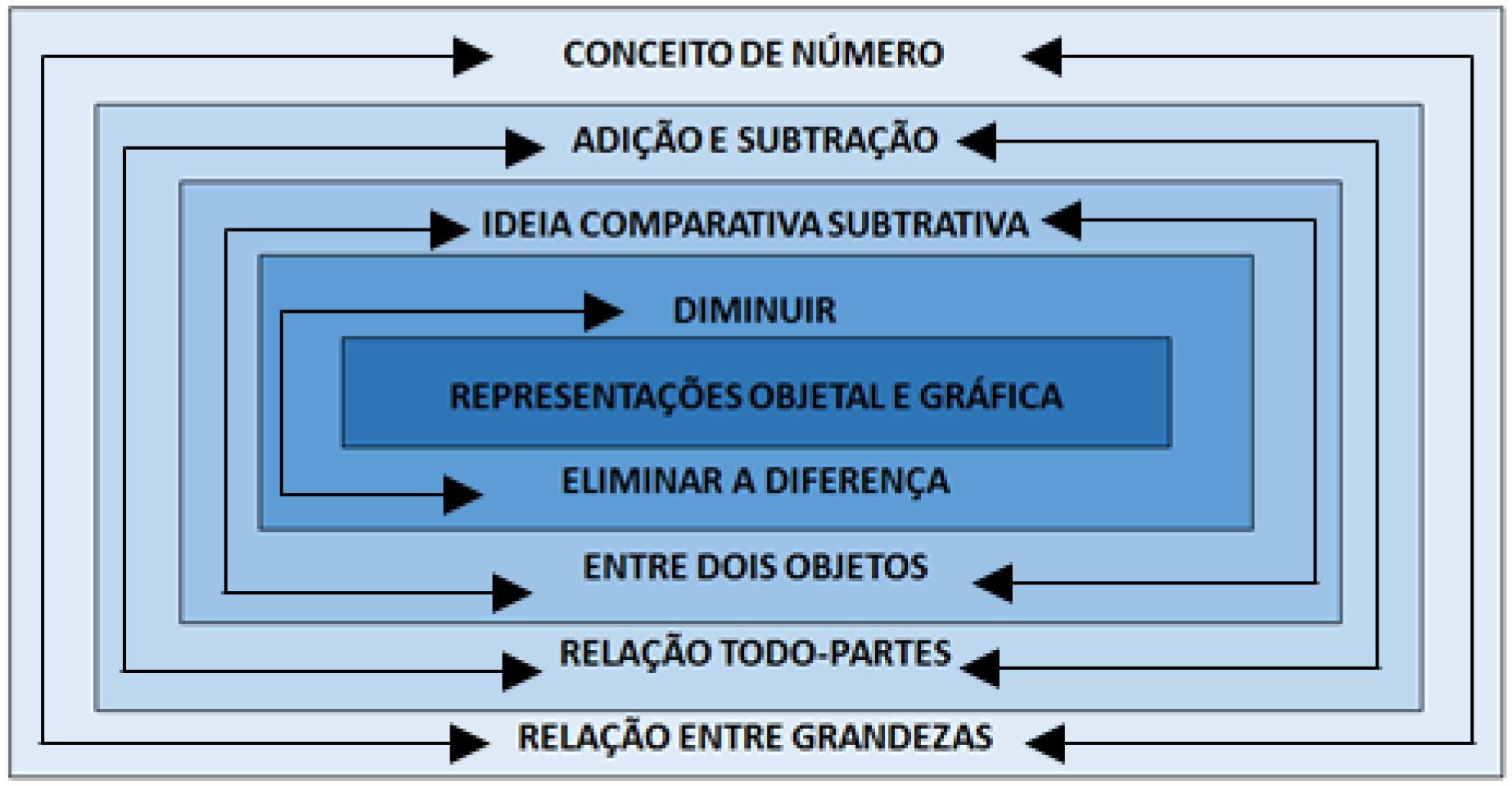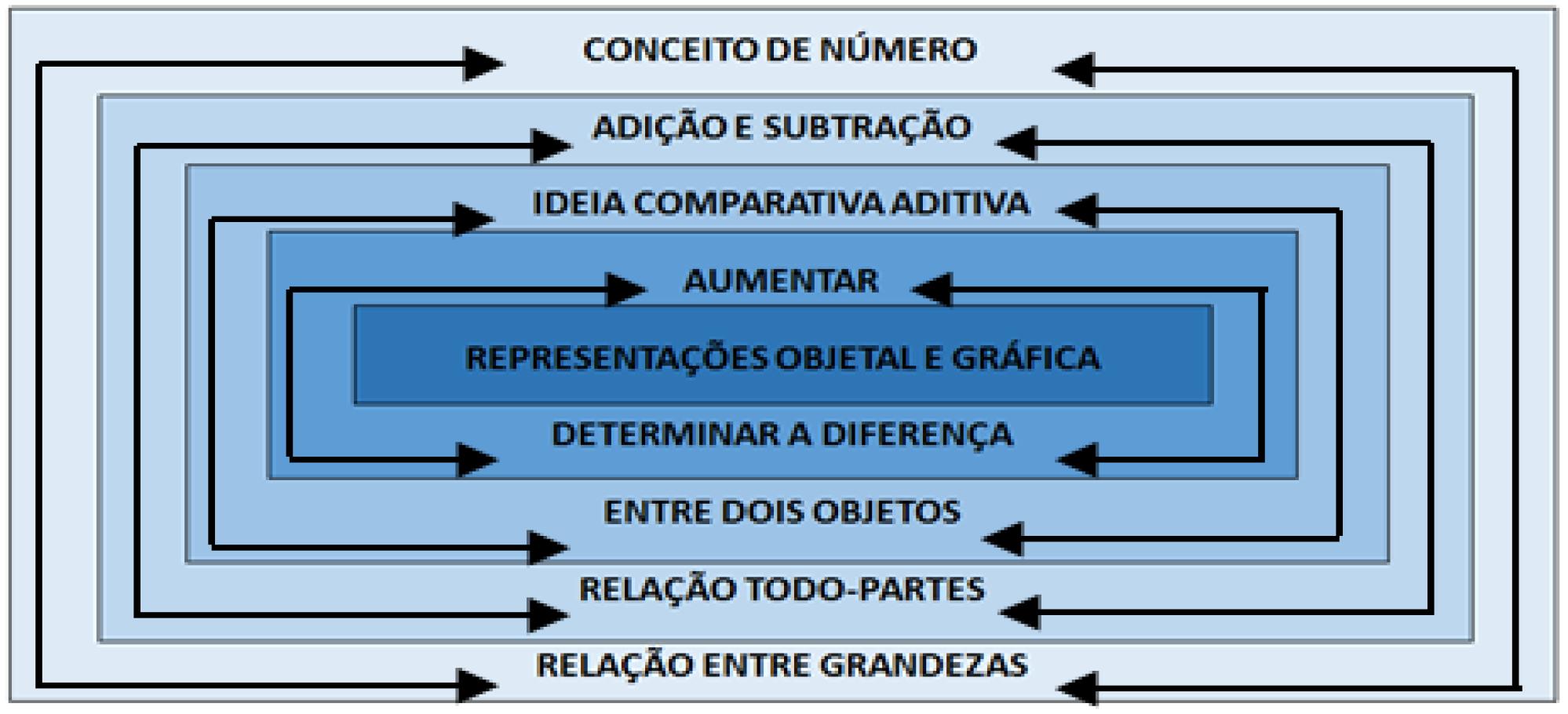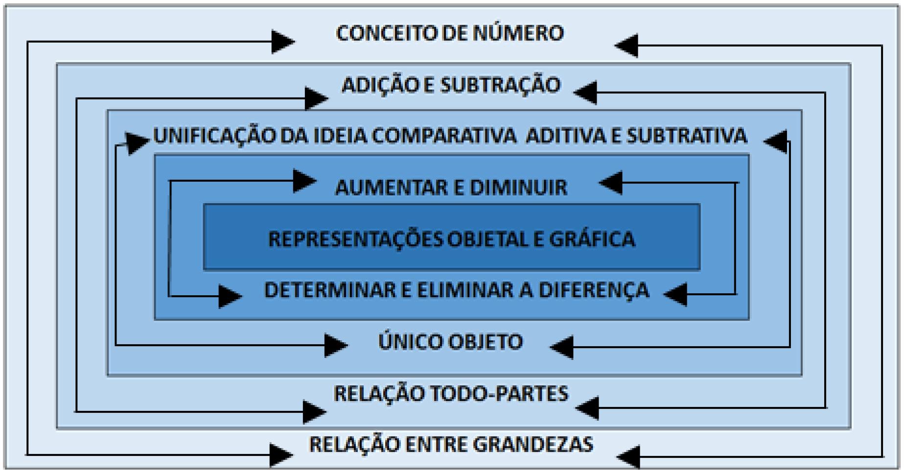 Observa-se, ainda, que as tarefas não seguem um movimento linear, mas de ida e volta. A apreensão de um componente ou ideia peculiar à adição e subtração ocorre numa inter-relação em que, necessariamente, um precisa de outro. O movimento de ida prescinde do movimento de volta, cujo componente gerador é a desigualdade que cria necessidade de determiná-la ou eliminá-la. Estas se constituem em propriedades, respectivamente, da adição e subtração. Por exemplo, “determinar ou tirar líquido” e “aumentar ou riscar segmento” se caracterizam em especificidades conceituais do sistema adição/subtração. Portanto, a diferença gera o movimento caracterizador da relação de igualdade e desigualdade que proclama pela relação essencial todo-partes, geral, dos referidos conceitos.
