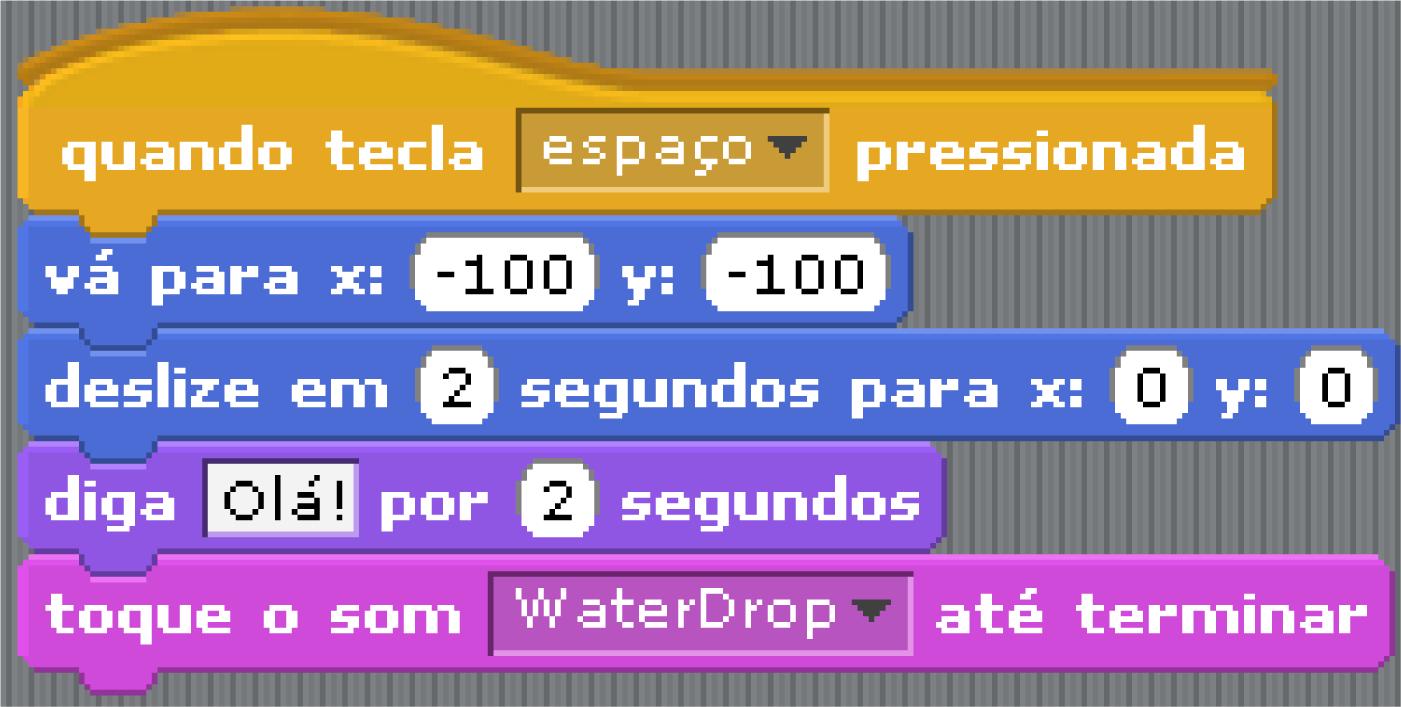 O principal programa usado na construção dos jogos foi o Scratch, que é um software livre desenvolvido no MIT (Massachusetts Institute of Technology). Constitui-se como uma linguagem de programação visual e permite ao usuário construir interativamente suas próprias histórias, animações, jogos, simuladores, ambientes visuais de aprendizagem, músicas e arte. Os comandos são visualizados por meio de blocos que são arrastados para uma área específica e conectados, formando a programação do ambiente (Figura 2).