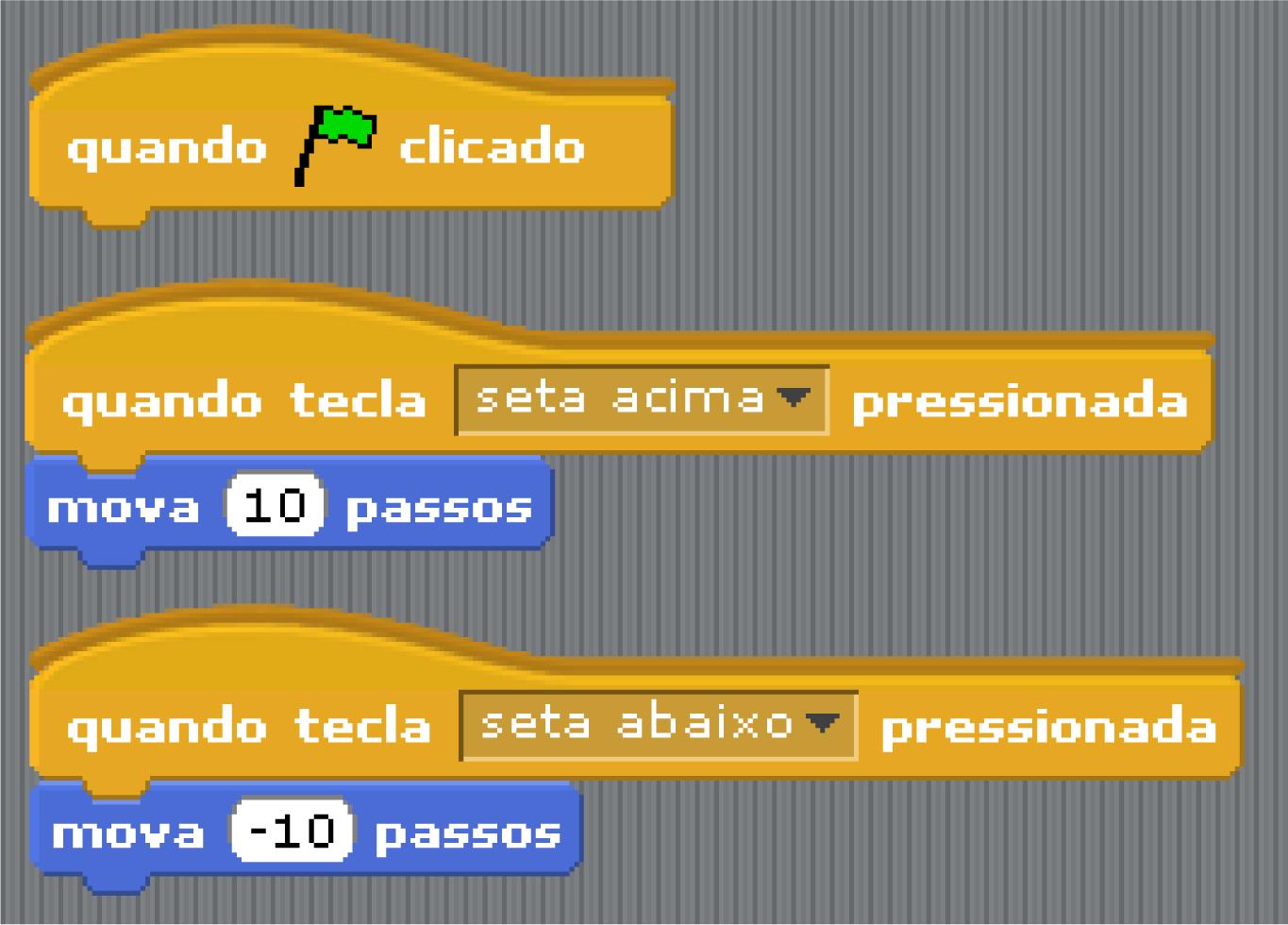 Como em alguns jogos eletrônicos, as participantes optaram por manter o objeto carro em um posicionamento horizontal constante no lado esquerdo da tela, limitando seus movimentos no sentido vertical apenas. É justamente esse movimento que a Figura 5 apresenta, na qual podem ser observadas três linhas de comando. A primeira (de cima para baixo) refere-se ao início do jogo. Quando a bandeira verde4 é clicada, inicia-se determinada sequência de comandos (no caso, não há comando associado a esse controle). O segundo e o terceiro blocos de comando referem-se aos movimentos programados para as setas do teclado. Quando a tecla “seta acima” é clicada, o objeto que se refere a esse comando (no caso, o carro) se movimentará 10 passos na direção vertical (eixo cartesiano y), no sentido para cima. De forma similar, quando a tecla (seta abaixo) for clicada, o objeto se movimentará −10 passos na direção vertical, isto é, se movimentará 10 passos para baixo.