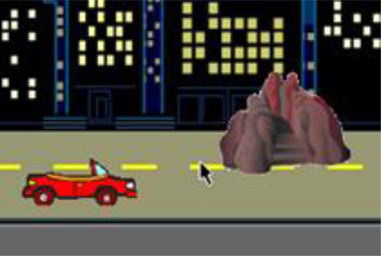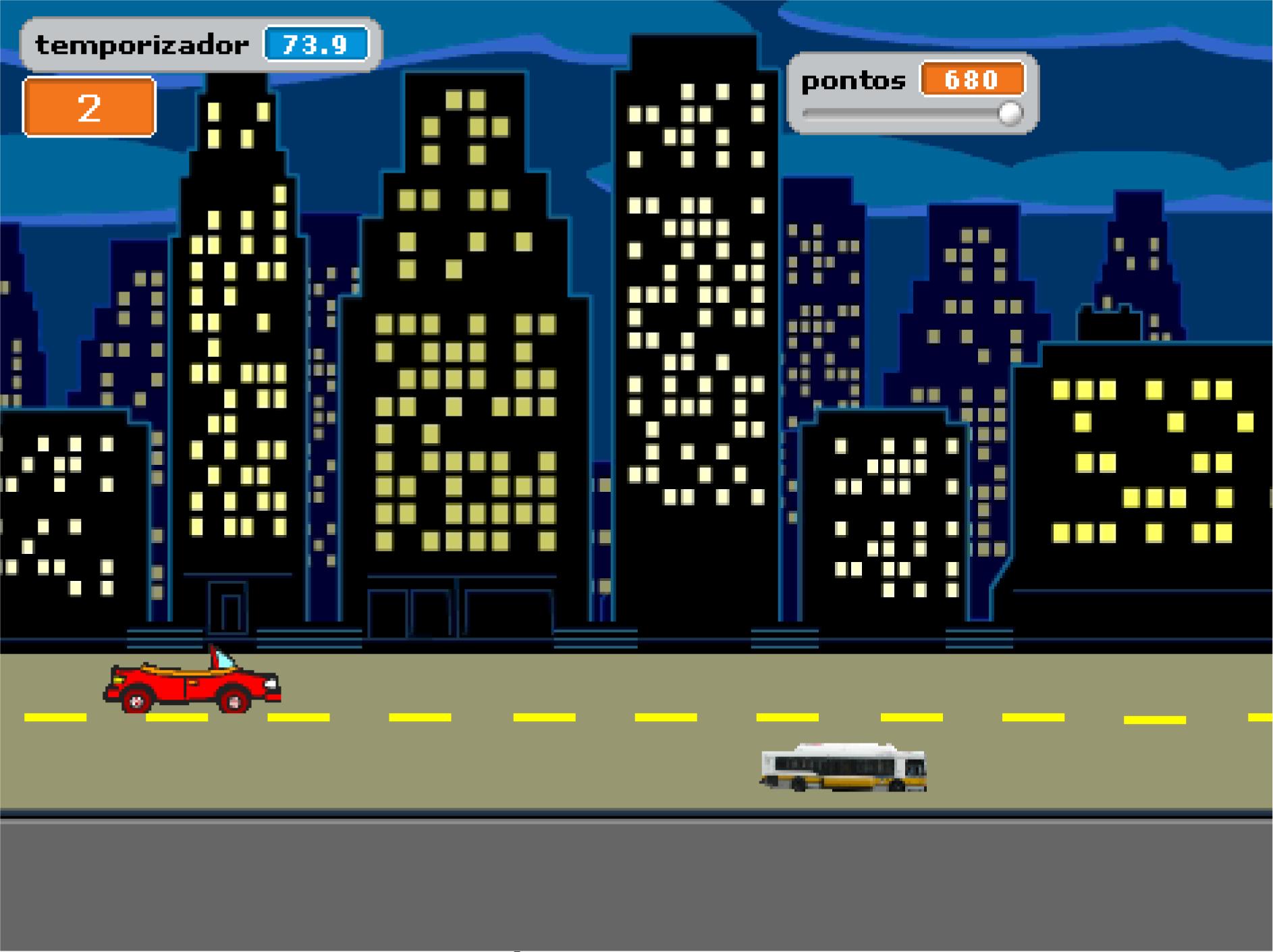Como não há limitações para a altura atingida, o objeto se movimentará por todo espaço destinado ao jogo (que possui uma amplitude eixos cartesianos que varia de −230 a 230 espaços). Para dar a sensação de movimento (uma vez que o objeto carro fica imóvel horizontalmente), as alunas optaram por movimentar o obstáculo na direção do carro. O aspecto visual do jogo (aquilo que aparece na área denotada por estágio) pode ser visto na Figura 4.