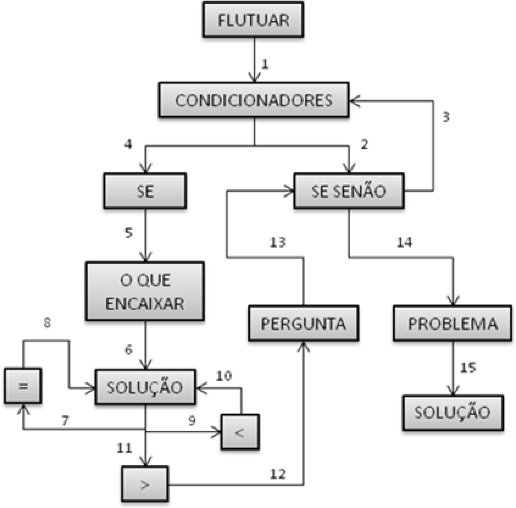 Isso apresenta o problema como um fluxo que se desenvolve e se mostra somente no próprio caminho percorrido, ou, conforme Deleuze (1988) defende, determina-se ao longo do próprio processo que envolve a busca por uma solução. A cada nova determinação, novas possibilidades são consideradas, direcionando o campo problemático que tem como consequência final ações transformadoras da organização do jogo eletrônico (no caso). Este aspecto pode ser observado no fluxograma apresentado pela Figura 6, no qual o “flutuar” se desdobra no uso de “condicionadores” que, por sua vez se bifurcam, formando dois fluxos a entrelaçar-se de modo não necessariamente linear e conduzem a constantes transformações nos modelos construídos.