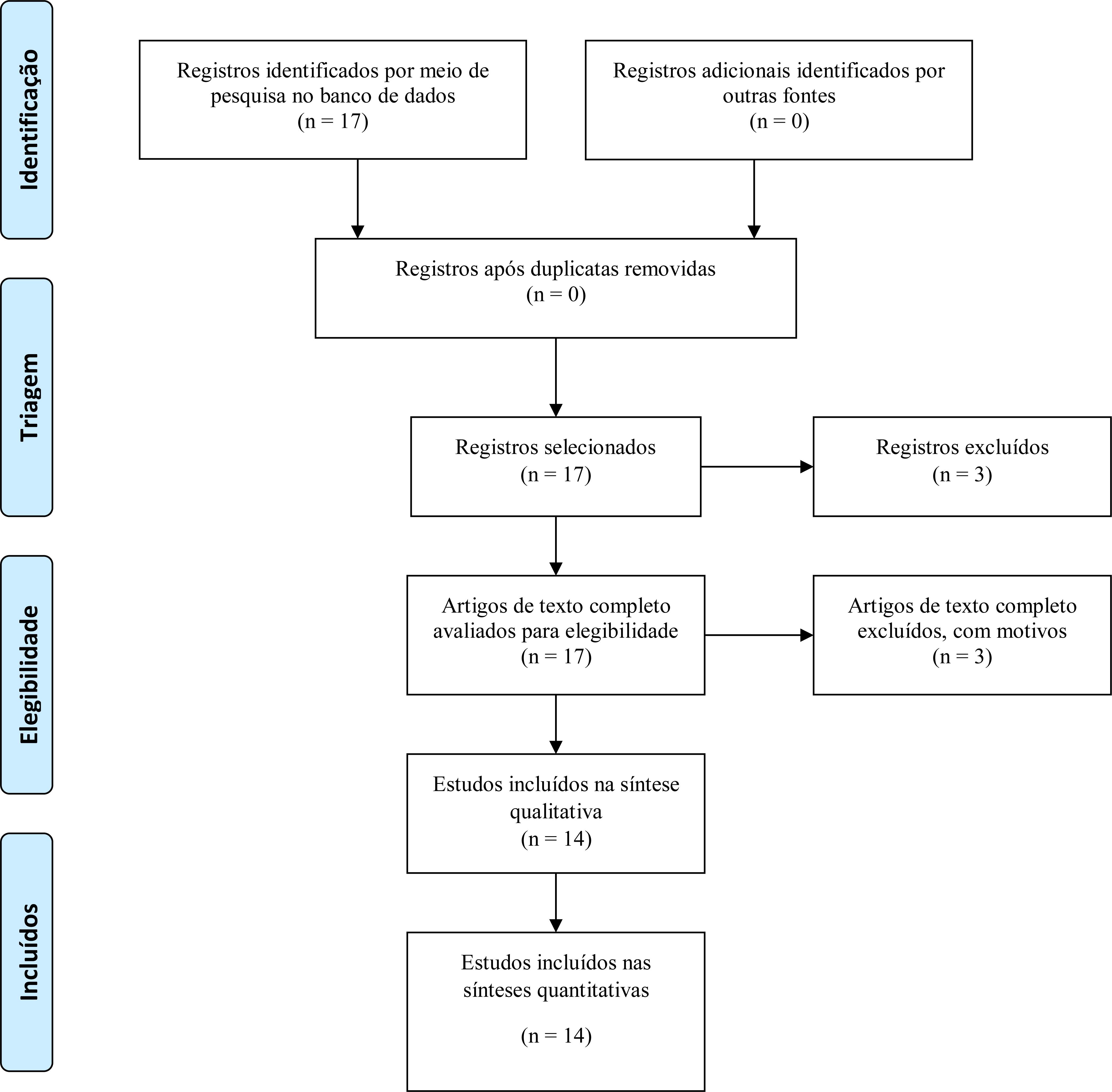 O fluxograma PRISMA foi utilizado como parâmetro para conduzir a identificaçâo, triagem, elegibilidade e inclusâo de estudos para essa Revisâo Sistemática, conforme Figura 1.