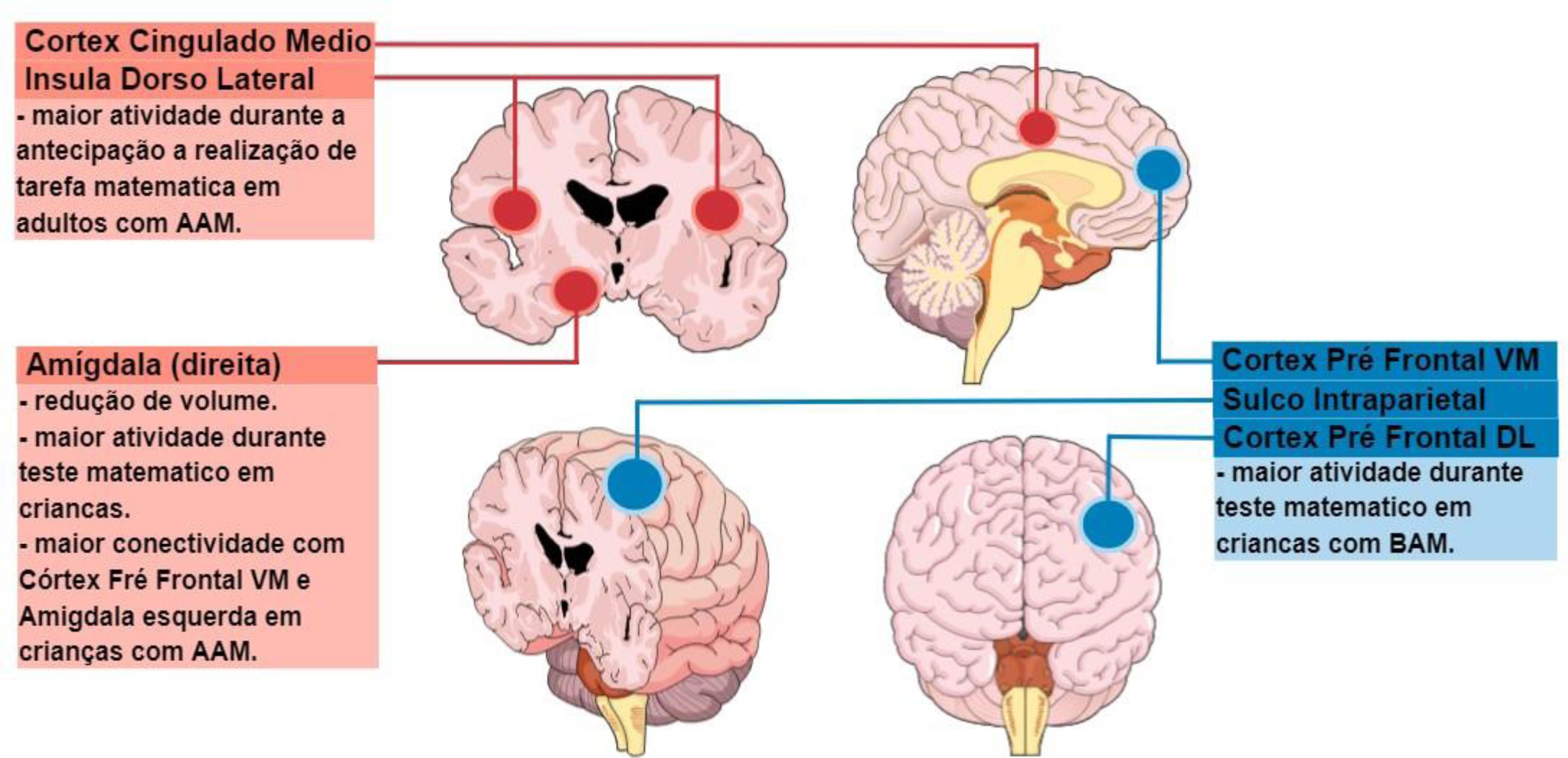 Os poucos estudos conduzidos por fMRI mostraram que, pelo menos duas bases, cerebrais estâo envolvidas na resposta emocional da Ansiedade Matemática: a rede de medo e a rede de dor. Sugere-se que os déficits de desempenho matemático em indivíduos com alta AM estâo associados a atividades nessas regiões cerebrais, comumente envolvidas na regulaçâo de emoções negativas, assim como em regiões subcorticais relacionadas a fatores motivacionais (LYONS; BEILOCK, 2012aARTEMENKO et al., 2015). Esses estudos sugerem que tais indivíduos podem superar seus déficits de desempenho aprendendo a controlar essa resposta emocional negativa, mesmo que a manipulaçâo numérica envolva custos significativos de memória de trabalho.