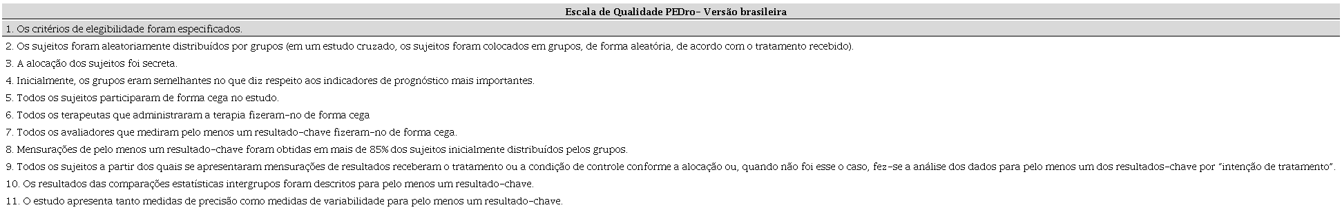 A qualidade dos estudos elegidos foi avaliada de modo independente pelo primeiro autor, baseado nos 11 itens da escala do Banco de Dados de Evidências Fisioterapêuticas (PEDro), conforme Quadro 1. A referida escala, amplamente utilizada na avaliaçâo de metanálises, afere de forma confiável características dos estudos, como randomizaçâo, cegamento, comparaçâo entre grupos e medidas de variabilidade (SHIWA et al., 2011).