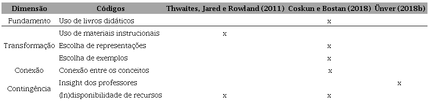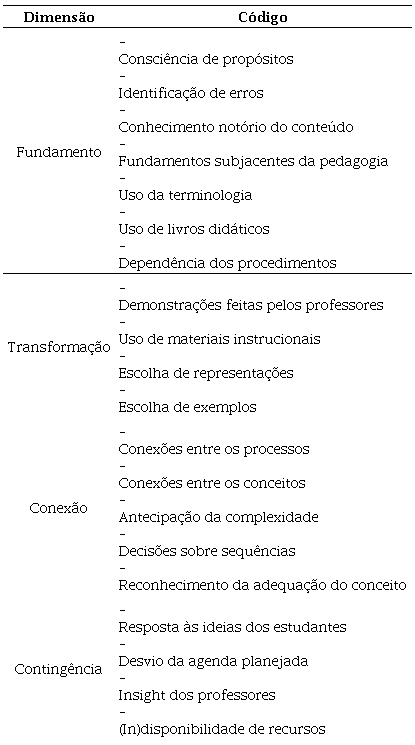A partir dos códigos, os autores estabeleceram compreensões sobre as quatro dimensões: (1) fundamento relaciona-se ao conhecimento e à compreensão da Matemática por si mesma, assim como aos propósitos da Educação Matemática e às condições para que os estudantes aprendam Matemática da melhor maneira; (2) transformação refere-se à apresentação das ideias para os estudantes, na forma de analogias, ilustrações, exemplos, explicações e demonstrações; (3) conexão abrange a sequência do material para o ensino e a consciência das necessidades cognitivas relativas a diferentes tópicos e tarefas; e (4) contingência representa a habilidade para responder de maneira convincente e fundamentada aos eventos não planejados no processo de ensino e de aprendizagem (ROWLAND, 2013).