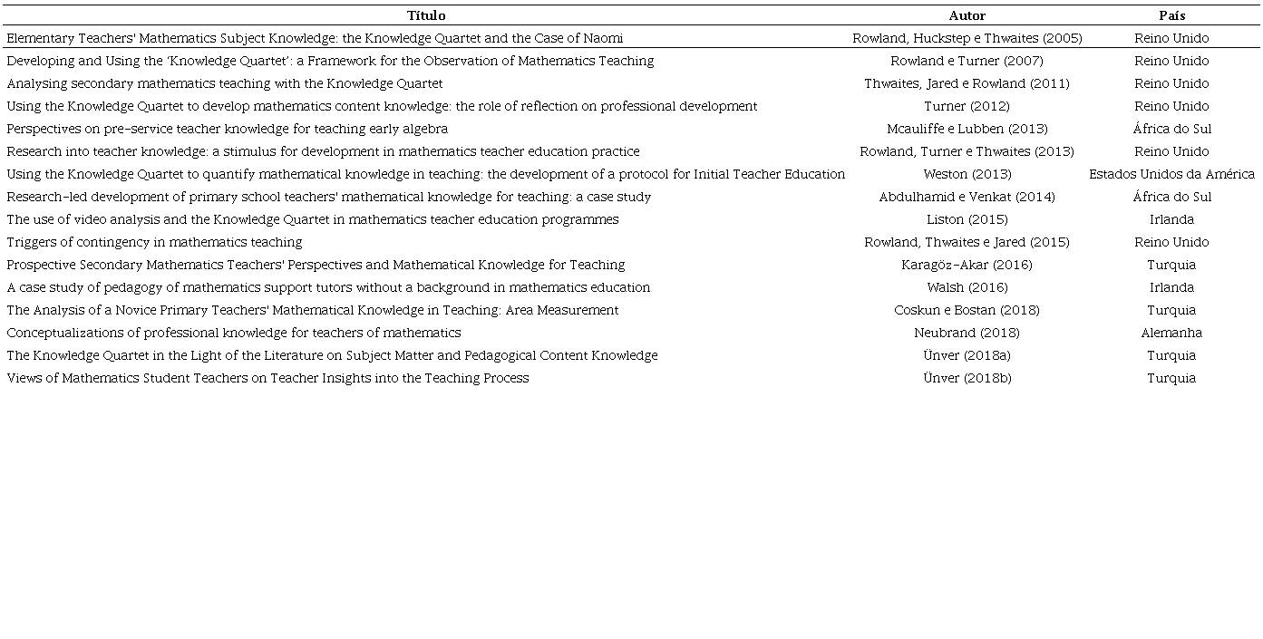 Os descritores foram determinados com a condição de que estivessem presentes no resumo, no título e/ou nas palavras-chave. Além disso, foram escritos em inglês, mesmo em buscas no Scielo, já que as publicações nacionais apresentam título, resumo e palavras-chave em outra língua. Assim, utilizamos como descritores as expressões “Knowledge Quartet” (entre aspas, para garantir que fosse um único termo de pesquisa) e mathematics. A partir desses critérios, encontramos 16 artigos, os quais estão descritos em ordem cronológica no Quadro 2.