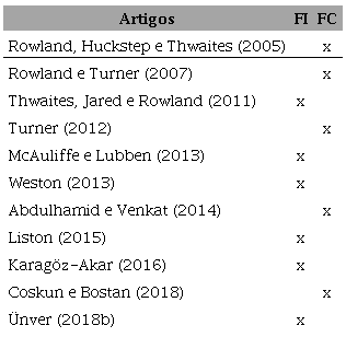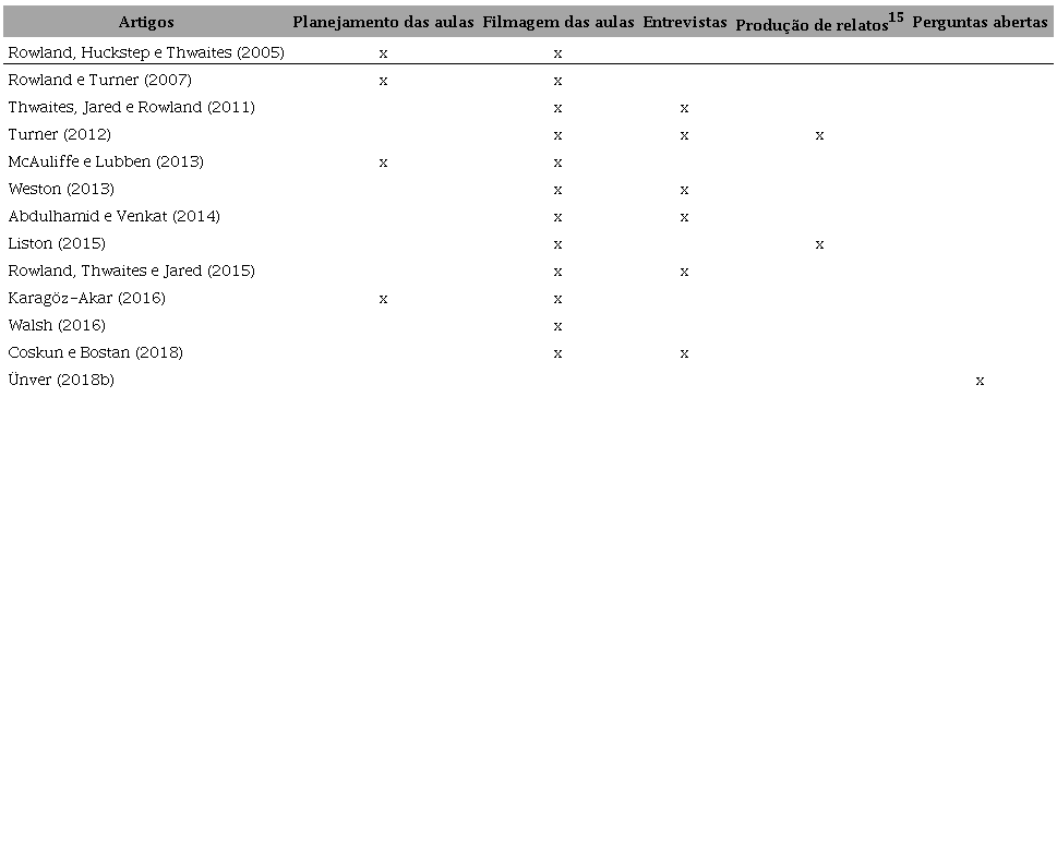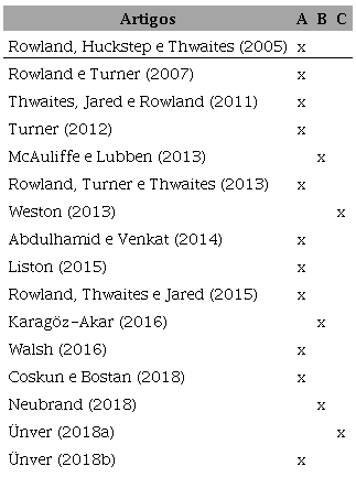 Dentre todos os artigos analisados neste trabalho, três aparecem como estudos teóricos (NEUBRAND, 2018; ROWLAND; TURNER; THWAITES, 2013; ÜNVER, 2018a). Além disso, com relação à natureza das pesquisas, somente o trabalho de Weston (2013) se desenvolveu a partir de uma abordagem quantitativa. Assim, devido à predominância da abordagem qualitativa, identificamos a presença de diversos instrumentos de produção de dados que são influenciados por valores, intenções, experiências de vida e condições sociopolíticas, tendo em vista que essa abordagem reconhece o conhecimento como dinâmico e não neutro (ARAÚJO; BORBA, 2004).