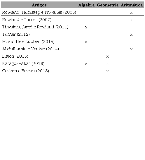Nem todos os artigos que compuseram esta síntese de literatura apresentaram o domínio matemático investigado. Entretanto, a partir dos nove trabalhos que divulgaram essa informação, a maioria abordou a aritmética, o que pode estar relacionado com o nível de ensino em que essas pesquisas foram desenvolvidas, visto que o KQ, inicialmente, foi proposto para os Anos Iniciais do Ensino Fundamental. Porém, destacamos trabalhos que contemplam a álgebra e a geometria, como também o de Karagöz-Akar (2016), o qual contemplou esses dois domínios.