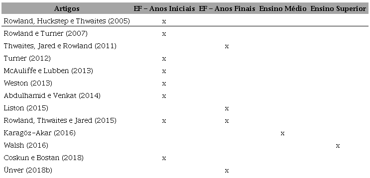 Como já comentado na subseção sobre domínio matemático, o desenvolvimento do KQ se deu através de pesquisas com professores dos Anos Iniciais do Ensino Fundamental (EF), o que, como demonstrado no Quadro 7, fez com que a maioria das pesquisas desta análise também contemplasse esse nível de ensino. Reconhecemos a carência de pesquisas no Ensino Médio e no Ensino Superior.