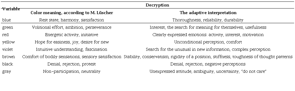Specialists of the psycho-diagnostics laboratory of Tomsk Polytechnic University have developed a particular modification of color selection method in order to investigate students’ attitude to teaching. The interpretation of colors is presented in Table 1.