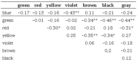 For the interpretation, we will rely on the decoding of the color associations presented in Table 1. The survey shows that the association with blue (thoroughness, reliability, durability) has a statistically significant negative correlation with violet (intuition, search for something unusual in the new information). The association with green (interest, the search for meaning for themselves, usefulness) has a statistically significant negative correlation with colors such as brown (stability, conservatism, inflexibility of a position, stiffness, toughness of thought patterns), black (denial, rejection, negative perceptions) and gray (indifference, uncertainty). The association with red (activity, initiative) has weakly significant (p <0.10) negative correlations with yellow (comfort) and gray (indifference). Somewhat unexpected was the presence of a significant negative correlation between yellow (comfort) and brown (stability, conservatism, the toughness of thought patterns): conservatism, the inflexibility of thinking in teaching and learning often causes discomfort and therefore is not as harmless as it seemed to us earlier. Thus, the analysis shows that the survey results as a whole do not contradict the color interpretations presented in Table 1, which agrees with Marukhina (2003) conclusions.