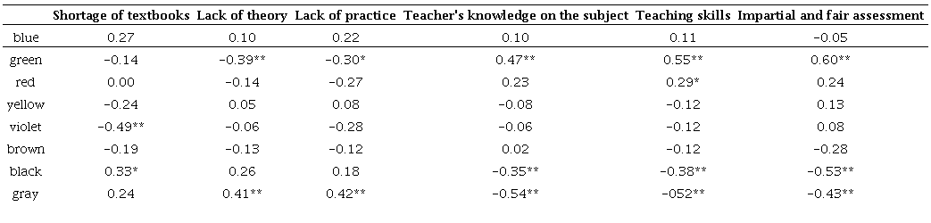 Next, we considered the correlation of CSM outcomes and outcomes of the LPES questionnaire, reflecting on the shortcomings of the learning process organization and teaching quality. The results can be found in Table 5. First of all, note that the colors blue and yellow do not have significant correlations with these items. However, green (cognitive activity), black (denial) and gray (indifference) have a close enough connection with items describing the teaching quality: Teacher's knowledge on the subject, Teaching skills and Impartial and fair assessment. In addition, the shortcomings in the learning process organization, although not provoking complete denial (there aren't any highly significant correlations of the items Lack of theory and Lack of practice with the item black), cause reduced cognitive activity (negative correlation of the items Lack of theory and Lack of practice with the item green) and contribute to the formation of indifference on the studied subject (a positive correlation of these two items with the item gray).