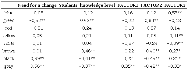 The variable Need for a change is an indicator of the students’ dissatisfaction with the studied course. Dissatisfaction has statistically significant connections with boredom (positive correlation with gray), lack of cognitive activity (negative correlation with green), and rejection (positive correlation with black). Courses which students have marked as well-known by them are associated with green and do not cause associations with such colors as brown (conservatism, inflexibility of thinking), black (negative perceptions), or gray (indifference). Shortcomings in course arrangement and gaps in teaching skills (Factor1) are associated with the formation of indifference (positive correlation with gray). Favorable moral climate (Factor2) is associated with creative activity (positive correlation with green), lack of boredom, rejection, and inflexibility (negative correlation with gray, black and brown). The intrinsic subject difficulty (Factor3) is associated with blue (thoroughness, reliability, and durability), lack of easiness, comfort, and intuition (negative correlations with yellow and violet). The presence of low-significance (p <0.1) correlations of the variable Factor3 can be interpreted as the absence of indifference for demanding disciplines (negative correlation with gray), the presence of inflexibility of thinking and rejection (positive correlation with brown and black).