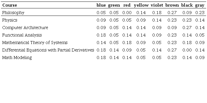 According to Table 3, the discipline Discrete Math causes associations with blue in 14% of respondents (the value of the blue variable is 0.14), with green in 18% of the students surveyed (the value of the green variable is 0.18), and so on. In general, we can conclude that for most of the 66 students, this course is associated with bright, optimistic colors. The attitude of students to the Sociology course is different. For 23% of students, this course is associated with gray (the value of the gray variable is 0.23). Following Table 1, gray means indifference. At the same time, there is only 9% of association with green (the value of the green variable for Sociology is 0.9). It is evident that this course did not arouse the students’ interest.