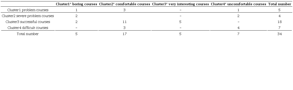 The cluster comparison for the two surveys (see Table 9) has revealed that none of the members of Cluster2 (severe problem courses) belong to Cluster2* (comfortable courses) or Cluster3* (very interesting courses). None of the members of Cluster3 (successful courses) belongs to Cluster4* (uncomfortable courses). All members of Cluster3* (very interesting courses) are members of Cluster3 (successful courses).