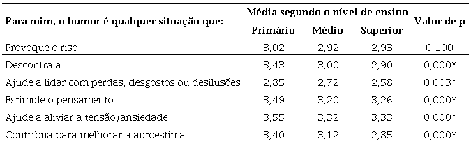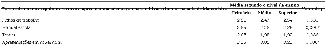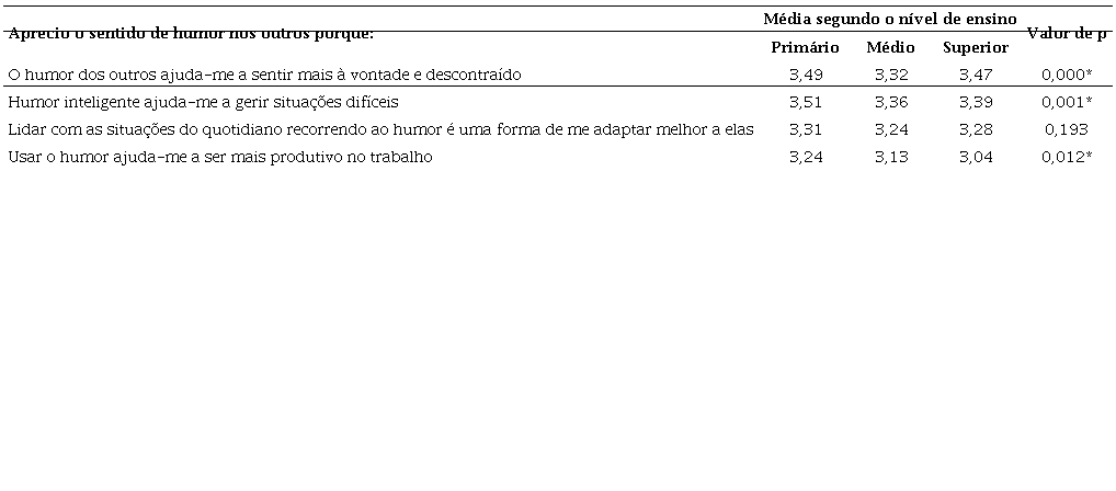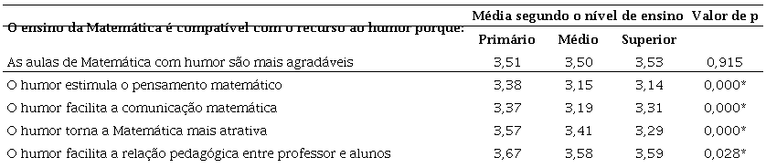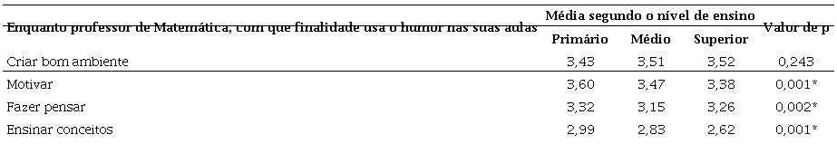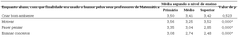Entre as médias dos três níveis de ensino, verifica-se que existem diferenças significativas em três dos quatro itens. Nos itens relativos aos atributos usar o humor com a finalidade de ‘Motivar’ e ‘Ensinar conceitos’ existem diferenças significativas entre os professores do EP e os professores de qualquer dos outros dois níveis de ensino. No outro item, relativo ao atributo usar o humor para ‘Fazer pensar', observaram-se diferenças significativas entre os professores do EP e os professores do EM.