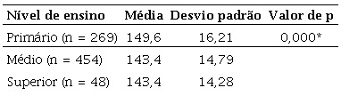 No caso da variável nível de ensino, apresentam-se na Tabela 12 a média e o desvio padrão de concordância e o valor de p relativos ao conjunto de todos os itens considerados, segundo o nível de ensino.