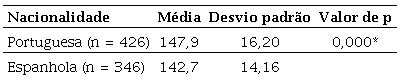 No caso da variável nacionalidade, apresentam-se na Tabela 13 a média e o desvio padrão de concordância e o valor de p relativos ao conjunto de todos os itens do questionário considerados, segundo a nacionalidade dos participantes.