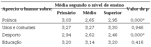 Comparando as médias dos três níveis de ensino, verifica-se que existem diferenças significativas em dois dos quatro itens, relativos aos atributos apreciar humor em assuntos de ‘Política’ e de ‘Desporto'. No primeiro item observaram-se diferenças significativas entre os professores do EP e os professores do EM, enquanto no outro item se observaram diferenças significativas entre os professores do EP e os professores de qualquer dos outros dois níveis de ensino.