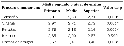 Na procura de assuntos de humor, os professores recorrem a diferentes fontes. Neste caso, os professores de todos os níveis de ensino concordam mais em procurar o humor em ‘Grupos de amigos', destacando-se também a ‘Televisão’ e o ‘Cinema’ nos professores do EP e a ‘Internet’ nos professores do EM e do ES (Tabela 5).