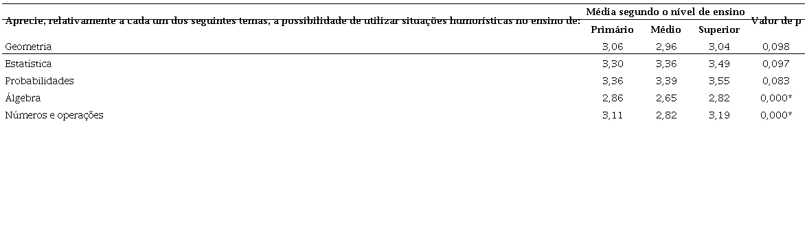 Comparando as médias dos três níveis de ensino, verifica-se que existem diferenças significativas em dois dos cinco itens. Nestes itens, relativos aos atributos utilizar situações humorísticas no ensino de ‘Álgebra’ e de ‘Números e operações', observaram-se diferenças significativas entre os professores do EP e os do EM.