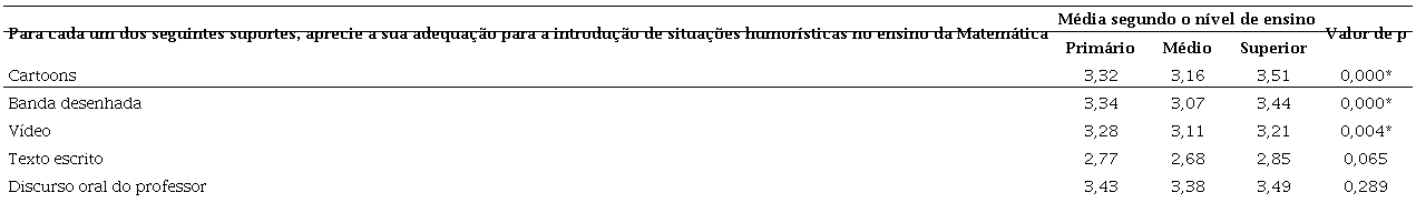 Comparando as médias dos três níveis de ensino, verifica-se que existem diferenças significativas em três dos cinco itens. Nos itens relativos ao uso de ‘Cartoons’ e ‘Banda desenhada’ observaram-se diferenças significativas quer entre os professores do EP e os professores do EM, quer entre os professores do ES e os professores do EM. No caso do uso do ‘Vídeo', observaram-se diferenças significativas entre os professores do EP e os do EM.