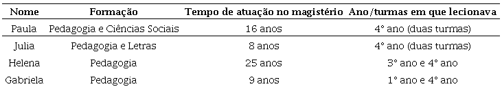 Ao todo, participaram da investigação quatro educadoras que trabalhavam em mais de uma escola da rede, aqui denominadas de forma fictícia por: Paula, Julia, Helena e Gabriela. O quadro 1 abaixo mostra algumas características das mesmas: