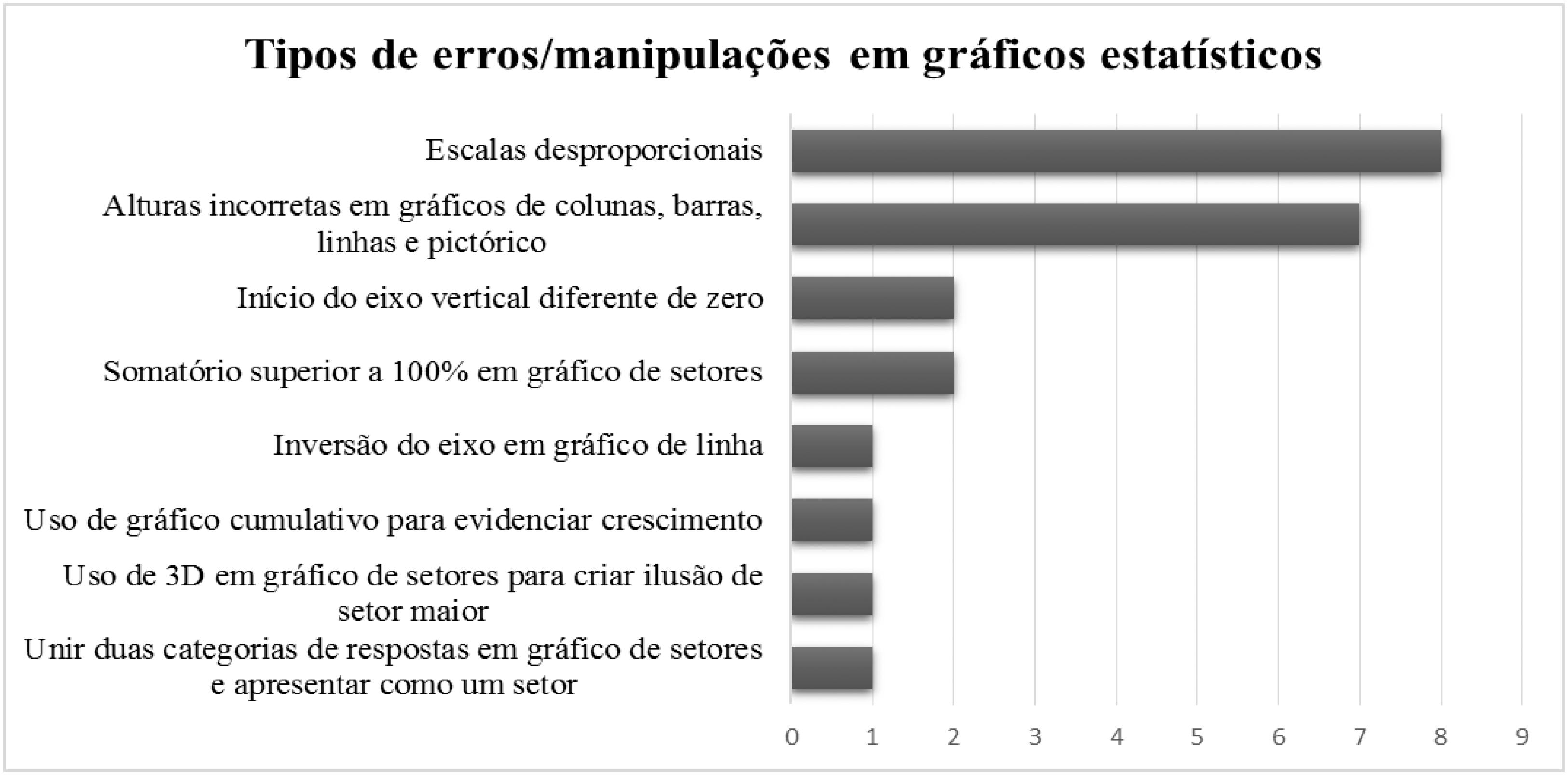 A partir dos resultados da etapa 2, os erros encontrados e analisados pelos estudantes estão relacionados no gráfico (Figura 1). Podemos constatar que, como a maioria dos gráficos selecionados são de colunas ou barras, os principais exemplos de erros e alterações estavam nas escalas e alturas incorretas das barras/colunas. Segundo Ainley (2000), gráficos feitos em computadores são dinâmicos e suas proporções podem ser facilmente alteradas ao se arrastar um dos vértices.