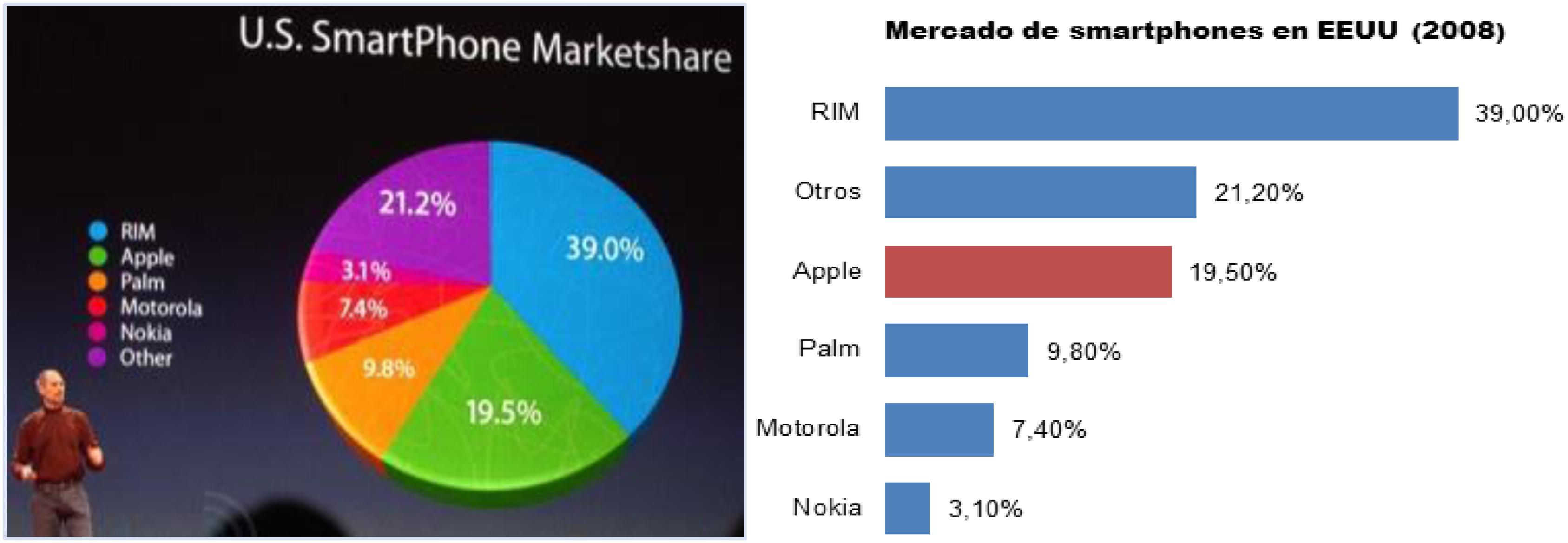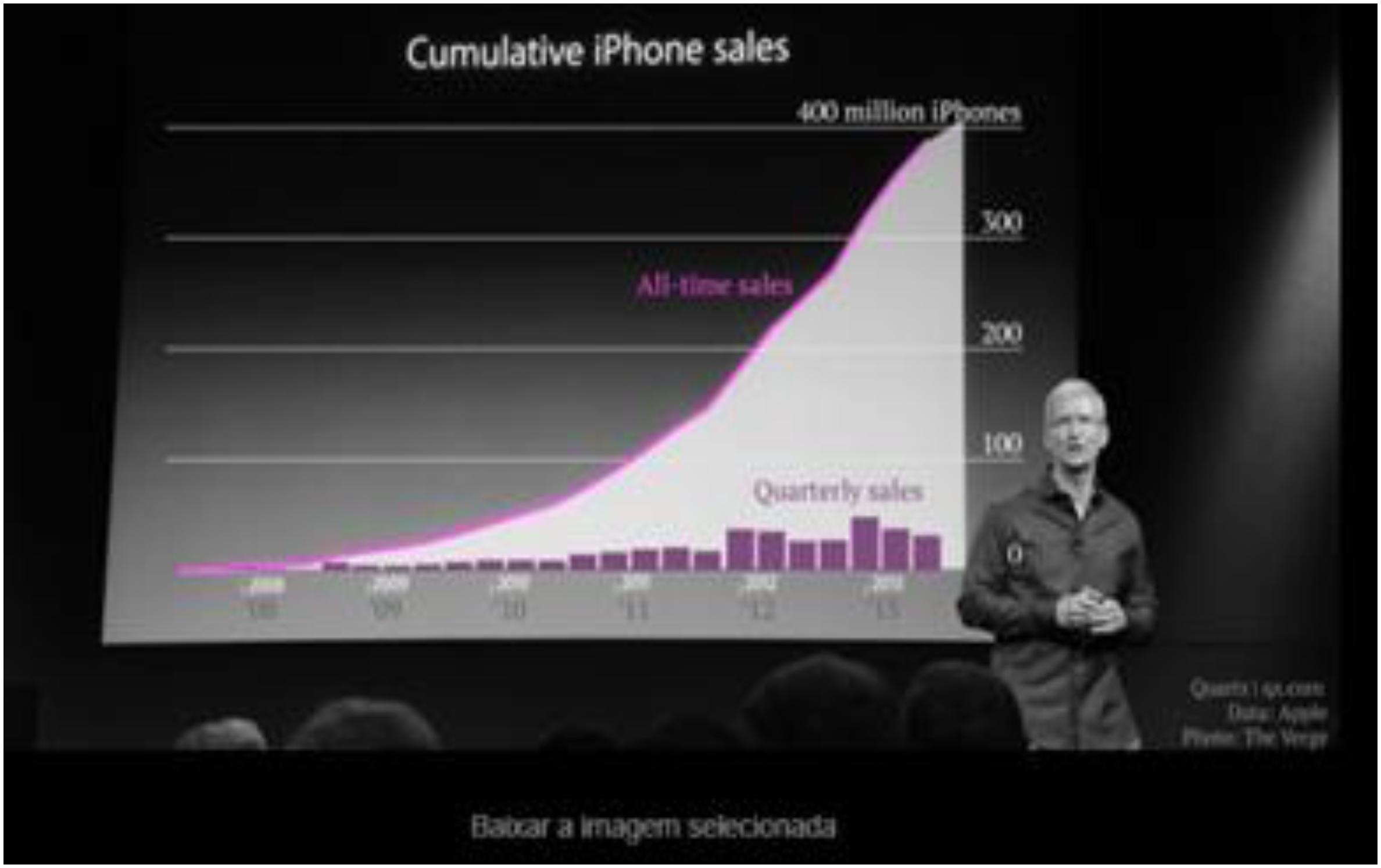 No gráfico abaixo, conforme destaca “El Arte de Presentar”, (o presidente da empresa) usou um gráfico de pizza em 3D em que a fatia da Apple está voltada para o público, o que faz com que ela pareça maior que a fatia outros que se encontram do lado oposto. Assim, através da manipulação visual faz parecer que os produtos da (empresa) estariam em segundo lugar nas vendas, quando na verdade estão em terceiro. Neste tipo de situação o mais adequado seria o uso do gráfico de barras como mostra a outra figura (Felipe, 2018).