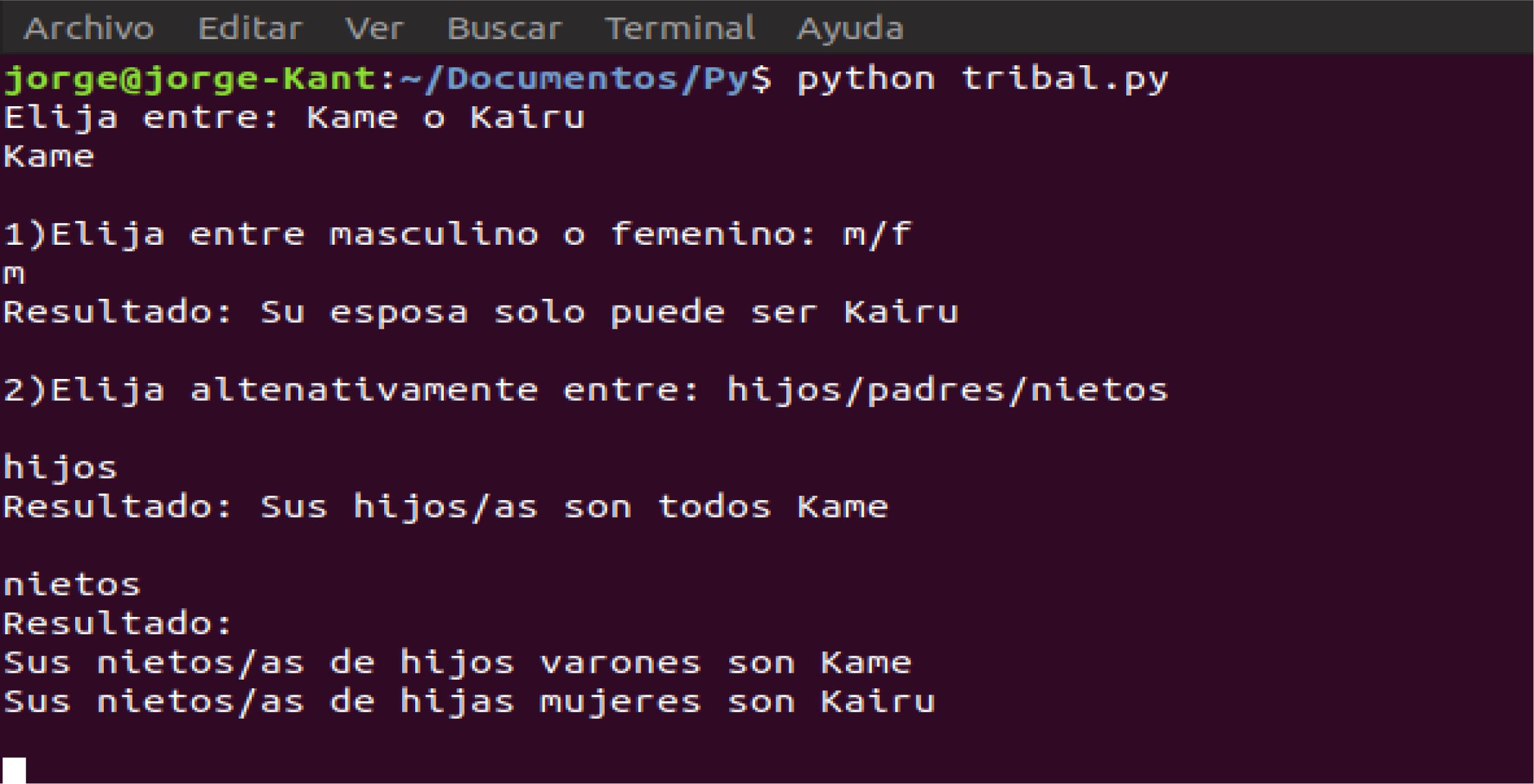 Hay varias alternativas para crear un conjunto de instrucciones ejecutables en lenguaje de programación Phyton que simulen el sistema de parentesco Kaingang, en general todas muy simples. Elegimos11 una que ilustre, de manera sencilla, el razonamiento con el que trabajamos. El programa se inicia, pidiendo que se indique la elección entre las mitades Kamẽ o Kanhru. Continúa, pidiendo una elección entre masculino y femenino y, a partir de allí, produce su primer resultado: informa con quién puede casarse el individuo de acuerdo con la información ingresada. Luego, pide que se elija alternativamente entre hijos, padres o nietos. De acuerdo con el valor que se ingrese el programa, informa a qué linaje clánica pertenecen los integrantes del grupo familiar.