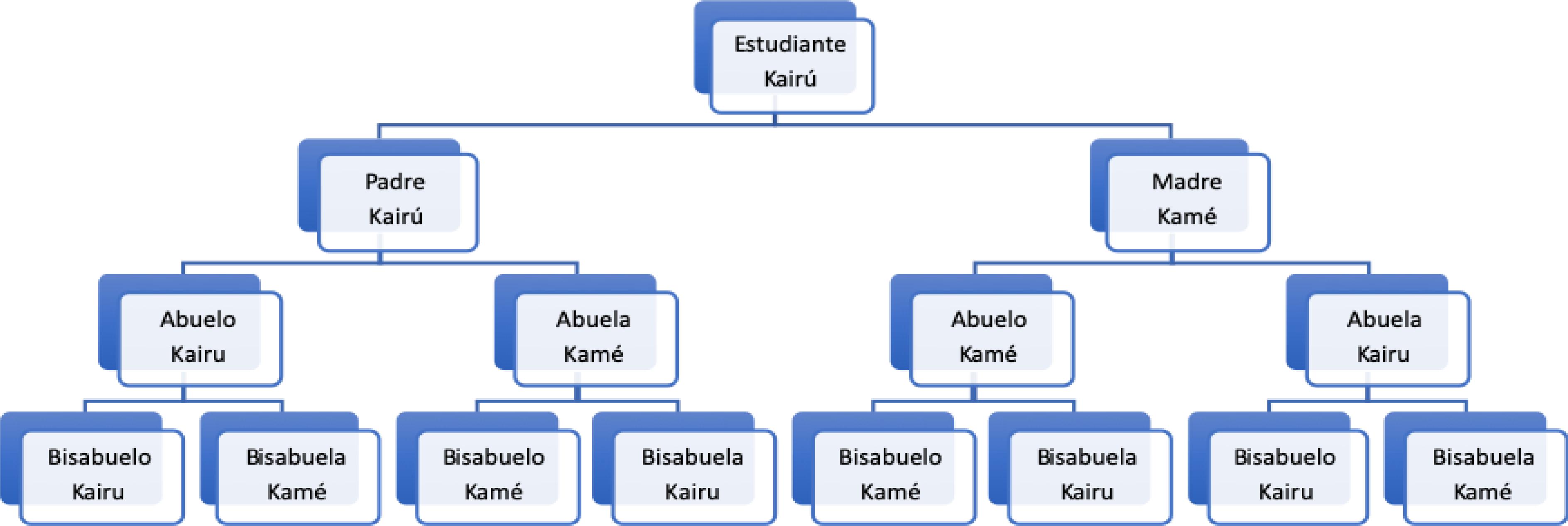 Sobre estos puntos, hubo un interesante intercambio y discusión en clase con nuestros estudiantes que fueron registrados en dos artículos científicos (BERNARDI; SANTOS, 2018; SANTOS; BERNARDI, 2019). Por iniciativa de los alumnos, hicimos el árbol de ascendencia de algunos de ellos. Esta experiencia mostró una ramificación binaria de ascendencia entre los pares clánicos que no habíamos percibido (Figura 2). Asimismo, discutimos algunas variantes actuales del sistema en diferentes comunidades, a fin de adaptarlas a los nuevos contextos. Por ejemplo, las utilizadas para incluir a individuos no Kaingang en la comunidad que van desde la postulación de un elemento neutro o indeterminado, a la formulación de nuevas subcategorías dentro de las dos mitades.