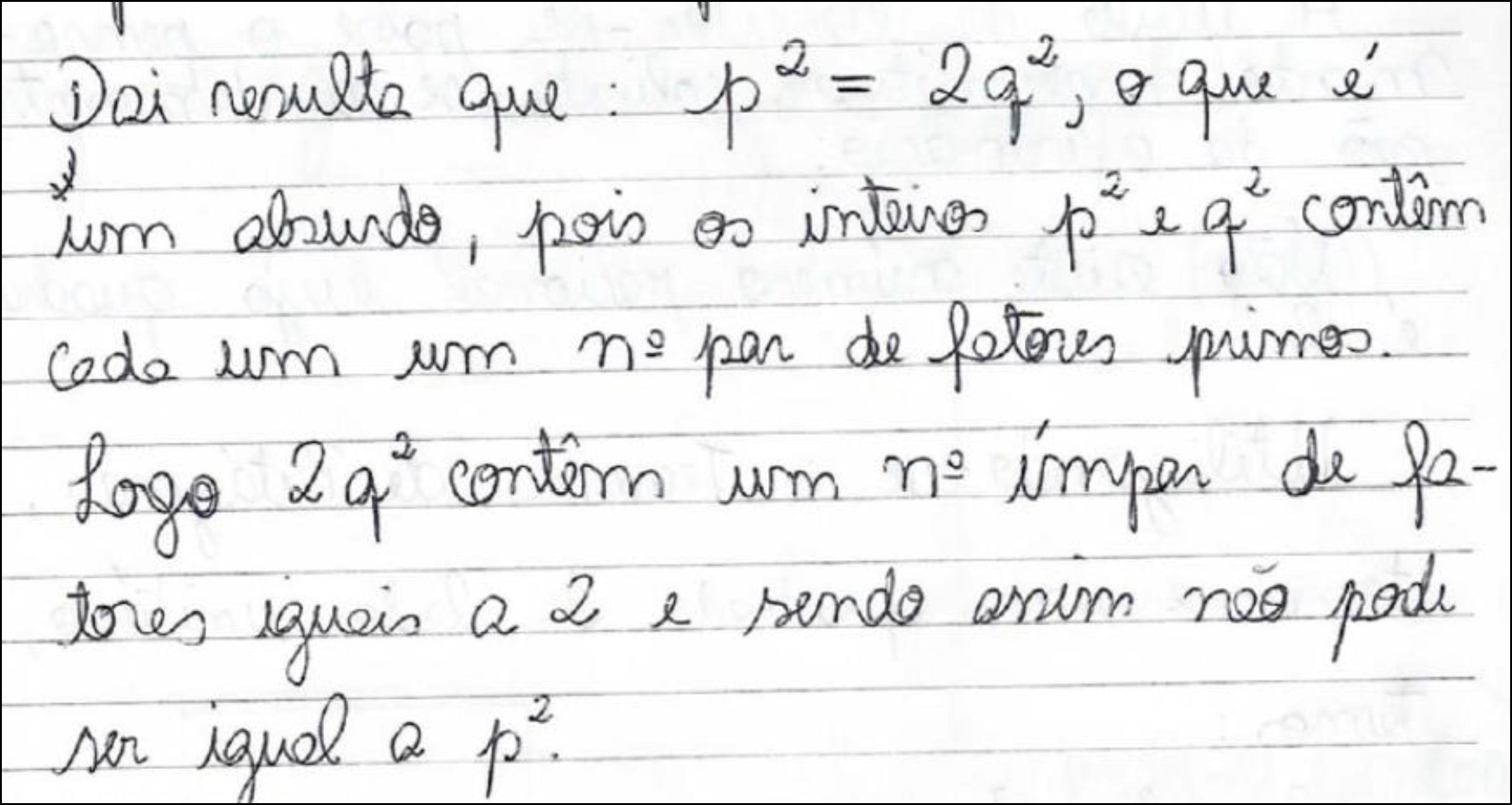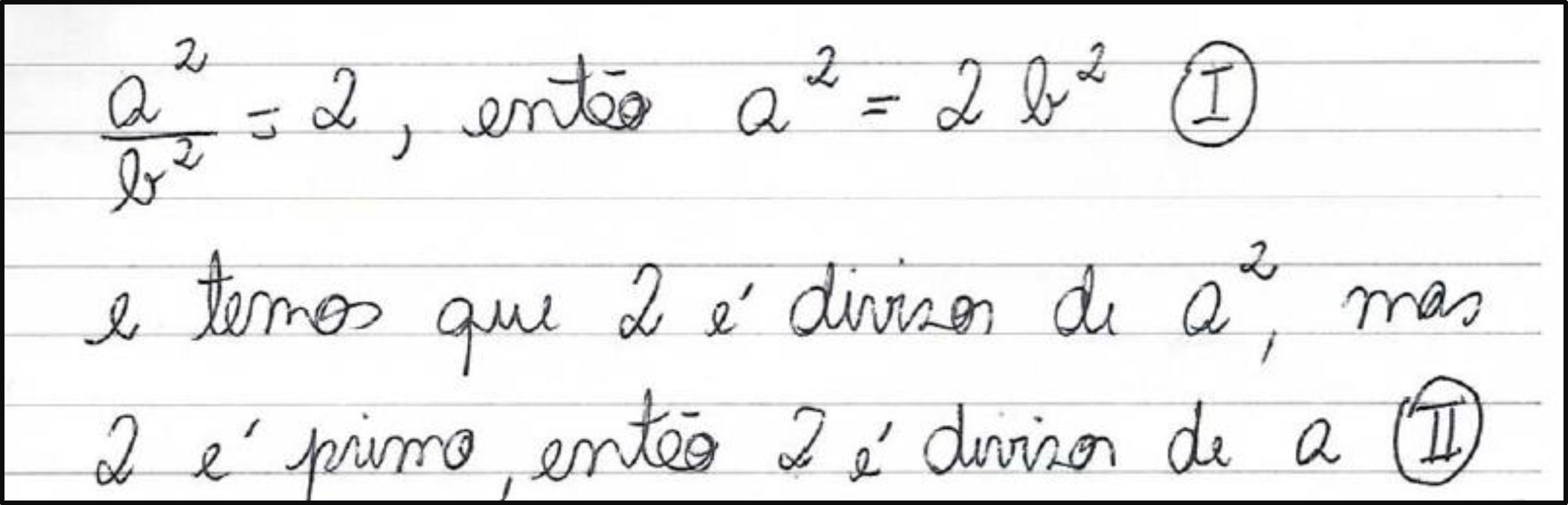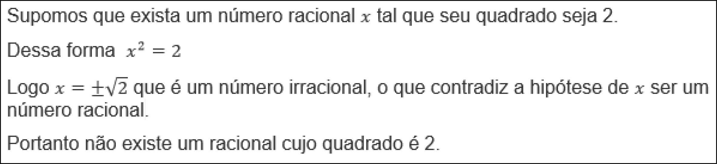 “A título de exercitar-se o pensamento matemático, solicita-se a demonstração da afirmação: Não existe um número racional cujo quadrado é igual a 2”.