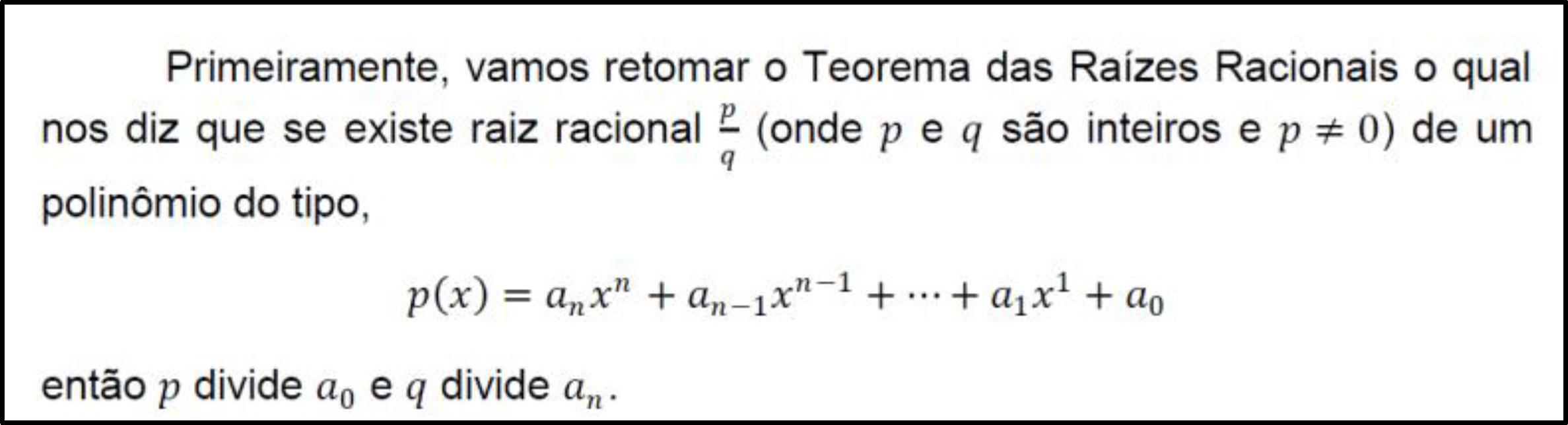 Notou-se, também, que o sujeito K mencionou o Teorema que lista os candidatos a raízes racionais para um polinômio com coeficientes inteiros, mas observou-se que falta a hipótese essencial: coeficientes inteiros. Portanto, o enunciado do teorema mencionado está incompleto. Além disso, cabe esclarecer que o sujeito, em sua argumentação, não testou nenhuma raiz, não utilizando, portanto, o teorema.
