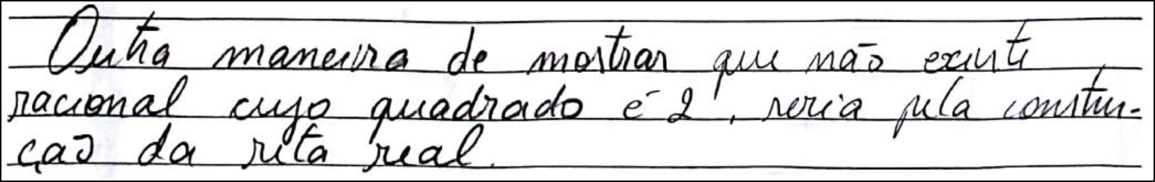 Embora as produções dos sujeitos H, I, J e K tenham sido tão comentadas quanto as anteriores, destaca-se aqui apenas o que parece mais relevante para o contexto deste estudo, isto é,o fato de que o aluno J utilizou-se de um apelo geométrico em sua resolução,algo que reforça a relevância do exercício proposto: aplicando o Teorema de Pitágoras a um quadrado de lado unitário, o enunciado do exercício traduz-se para a questão sobre a racionalidade do comprimento da diagonal do quadrado.Ao projetar-se a última resolução, a do sujeito L, ele afirmou não ter entendido a proposta da atividade, porém reconheceu que a exposição das produções dos colegas fez com que suas dúvidas fossem esclarecidas.
