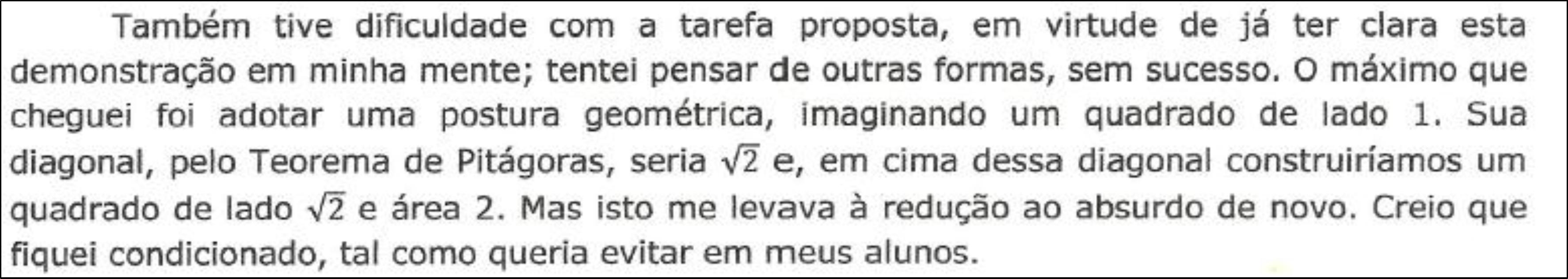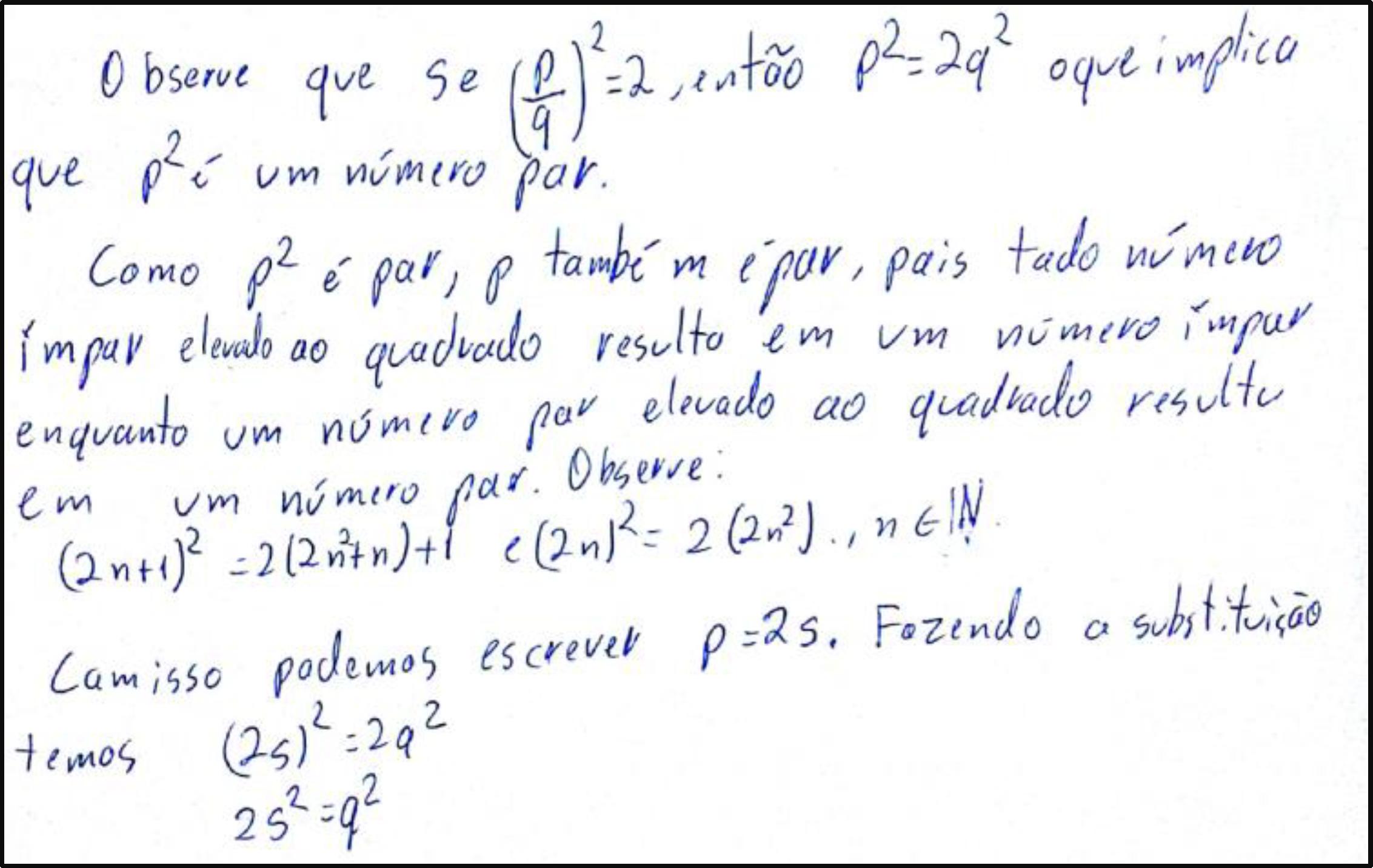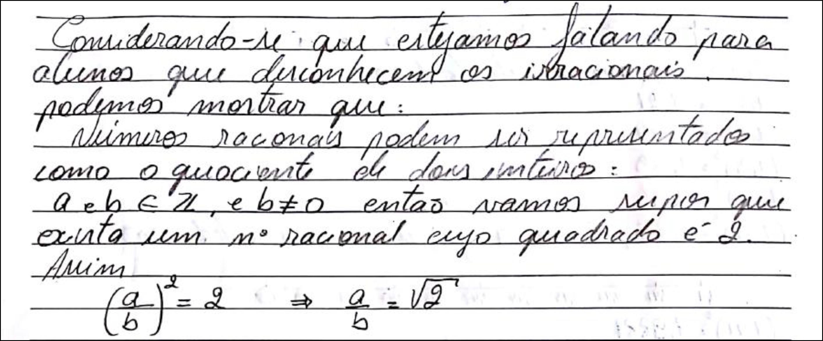 Esse sujeito, que certamente foi exposto ao conhecimento matemático em questão, pois cursou a disciplina Números e Funções, não percebeu que é justamente a proposição a ser demonstrada uma das afirmações que motiva a ampliação do universo numérico dos racionais. Portanto, não era esperado que, para demonstrá-la, fossem utilizados números irracionais.