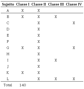 Finaliza-se essa seção ressaltando que nenhuma demonstração foi considerada totalmente correta e que alguns sujeitos cometeram erros em mais de uma classe. Na Tabela 1, apresenta-se um resumo dos erros cometidos por cada sujeito, e em qual classe isso ocorreu.