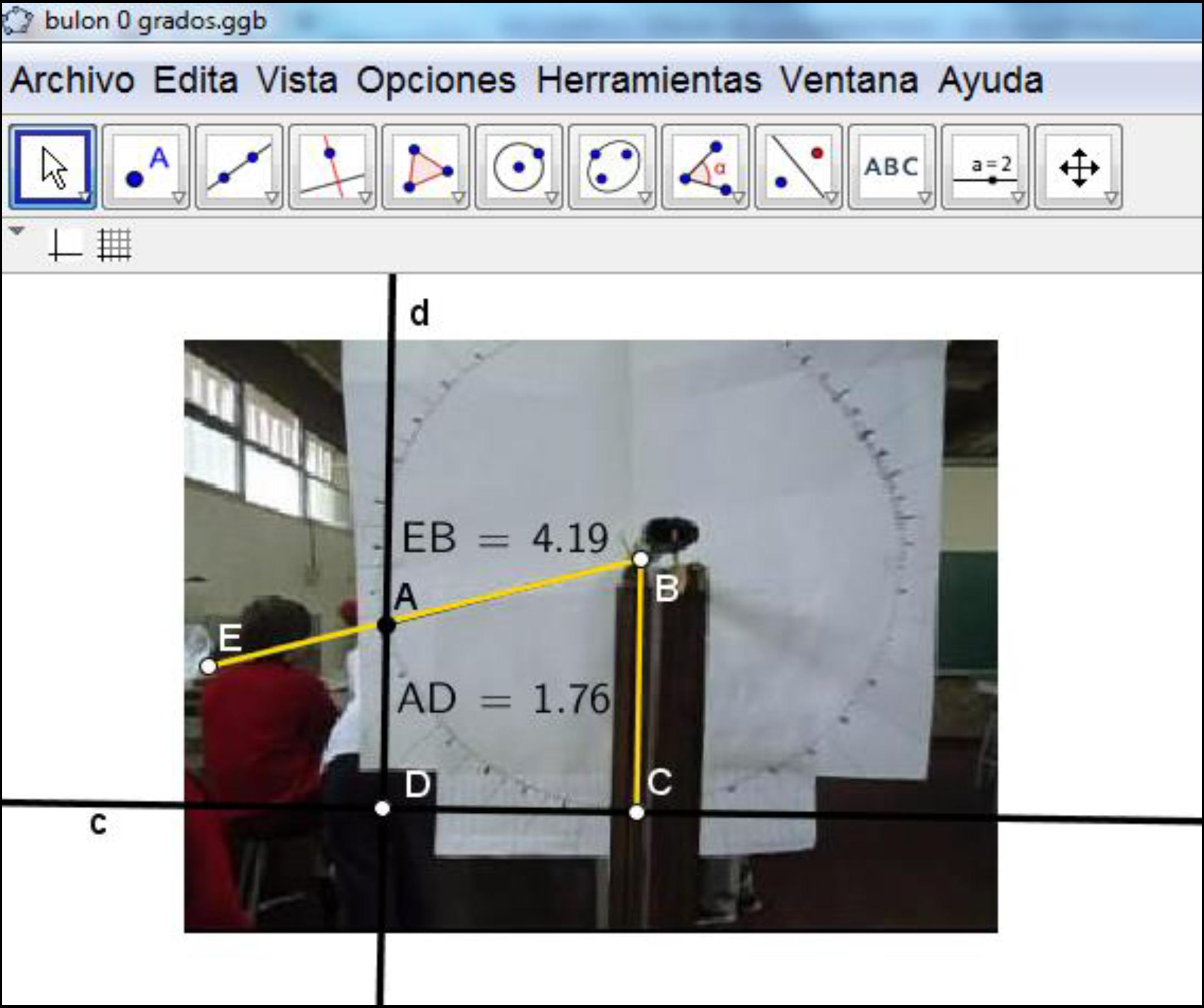 Primero se marcan los puntos A, B y C. B es el centro de la circunferencia graduada. A y C son puntos sobre la circunferencia. El punto A corresponde a la intersección del hilo con la circunferencia cuando la pelota alcanza la altura máxima en ese lanzamiento. El punto C corresponde al ángulo de 270°. Estos puntos determinan los segmentos AB y CB. Posteriormente, se traza la recta c, que pasa por C y es perpendicular al segmento CB y luego la recta d que pasa por A y es perpendicular a la recta c. La intersección entre las rectas c y d es el punto D. Una vez determinado el punto D, y haciendo uso de la herramienta Distancia o longitud, se mide la longitud del segmento AD (1.76, en el caso de la Figura 3) que es la altura máxima alcanzada por la pelota. Finalmente se ubica el punto E, que es el extremo del hilo del cual pende la pelota, y se mide la longitud del segmento EB (4.19, en el caso que muestra la Figura 3) que corresponde a la longitud del hilo que es de 26,5 cm.