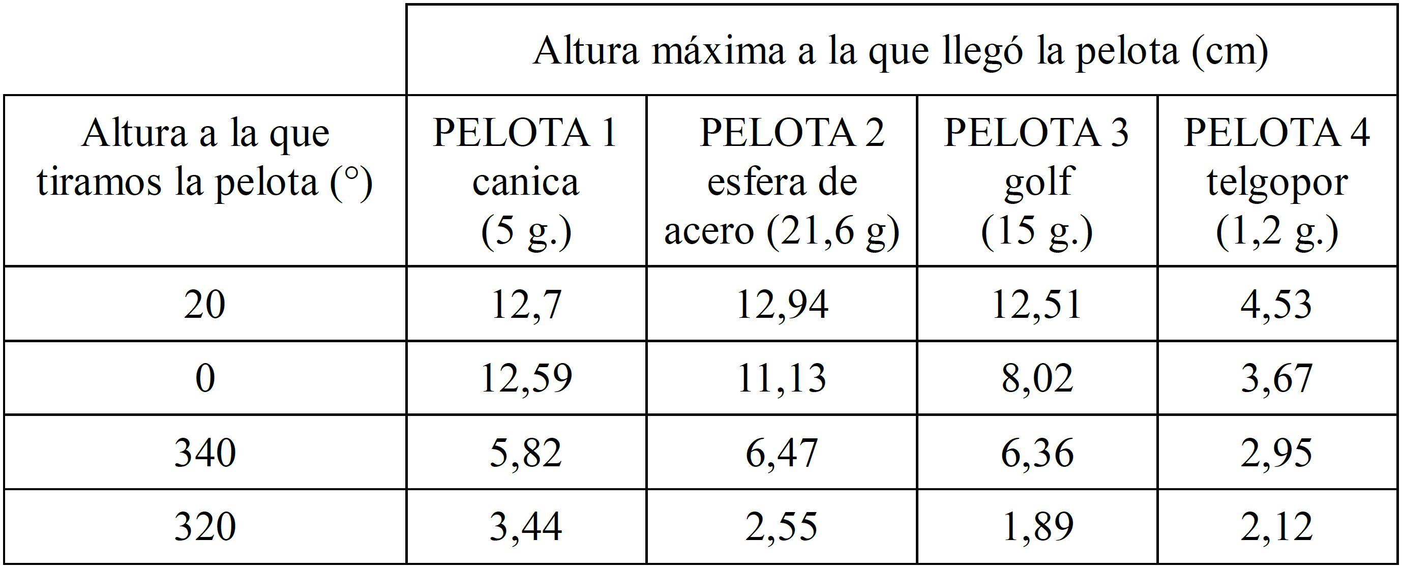 Luego, cada pelota fue arrojada desde cuatro alturas diferentes, asociadas con los siguientes ángulos: 20°, 0°, 320° y 340°, que eran localizados sobre la circunferencia graduada adosada al dispositivo (ver Figura 2). Los estudiantes explicaron: elegimos estos grados, porque no eran ni tan altos, como para que se nos doble el hilo al soltarlo, ni muy bajos, así la cámara captaba bien hasta donde llegaría la pelotita. La cámara que mencionan en esta afirmación, es una cámara filmadora de propiedad de uno de los estudiantes, que ellos mismos decidieron utilizar y que se convirtió en una herramienta fundamental para lograr las mediciones de la altura máxima a la que llegaba cada pelota al ser arrojada desde distintas alturas iniciales.