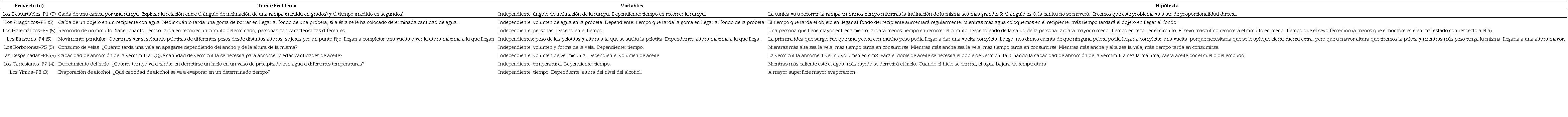 A fin de dar una idea global de los proyectos experimentales desarrollados y la participación de los estudiantes en la práctica de modelización que se puso en juego en cada una de las ocho pequeñas comunidades locales de práctica, se ha elaborado el Cuadro 1. La primera columna identifica cada proyecto con el nombre del grupo que lo produjo y un código que facilitará referencias posteriores; el número entre paréntesis informa la cantidad de estudiantes que conforma cada pequeña comunidad. Las siguientes columnas presentan sucesivamente el temay los problemas o preguntas que fueron formuladas; las variables seleccionadas y las hipótesis planteadas por los estudiantes. Con excepción el título que encabeza cada tema o problema, y que aparece subrayado, todos los textos del Cuadro 1 fueron producciones de los estudiantes, que extrajimos de sus informes finales. El cuadro brinda evidencia de tres actividades asociadas con fases del proceso de modelización matemática: formular problemas, seleccionar variables y plantear hipótesis.